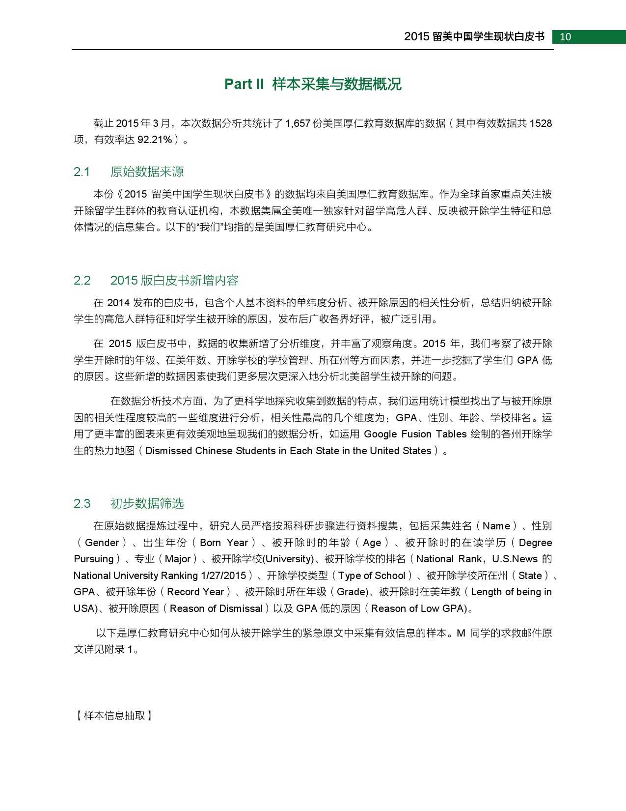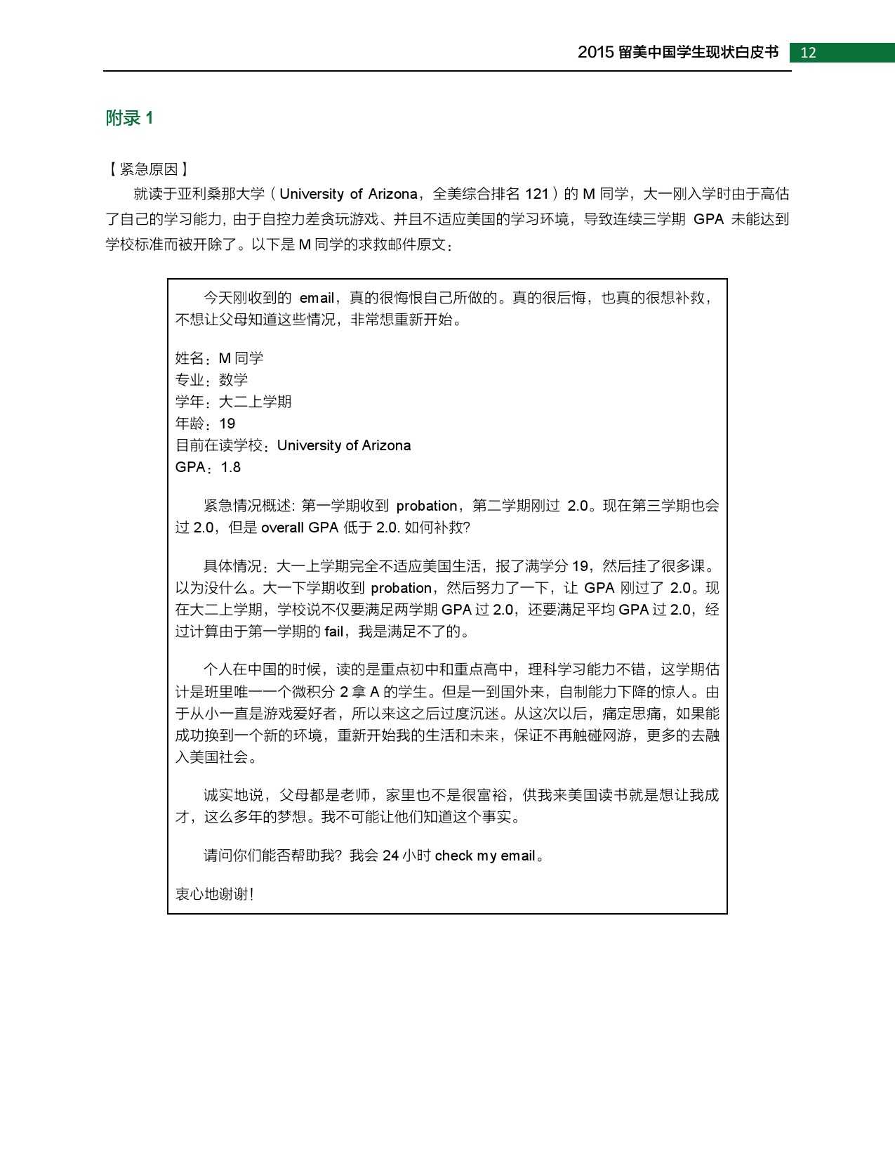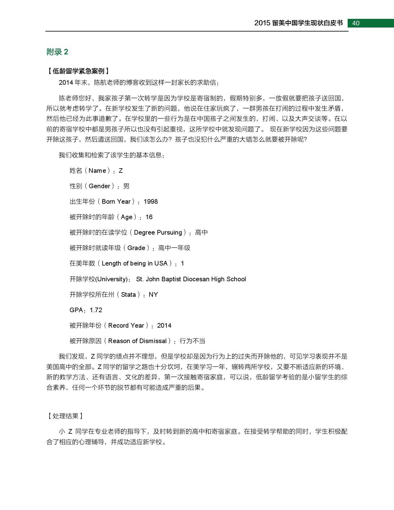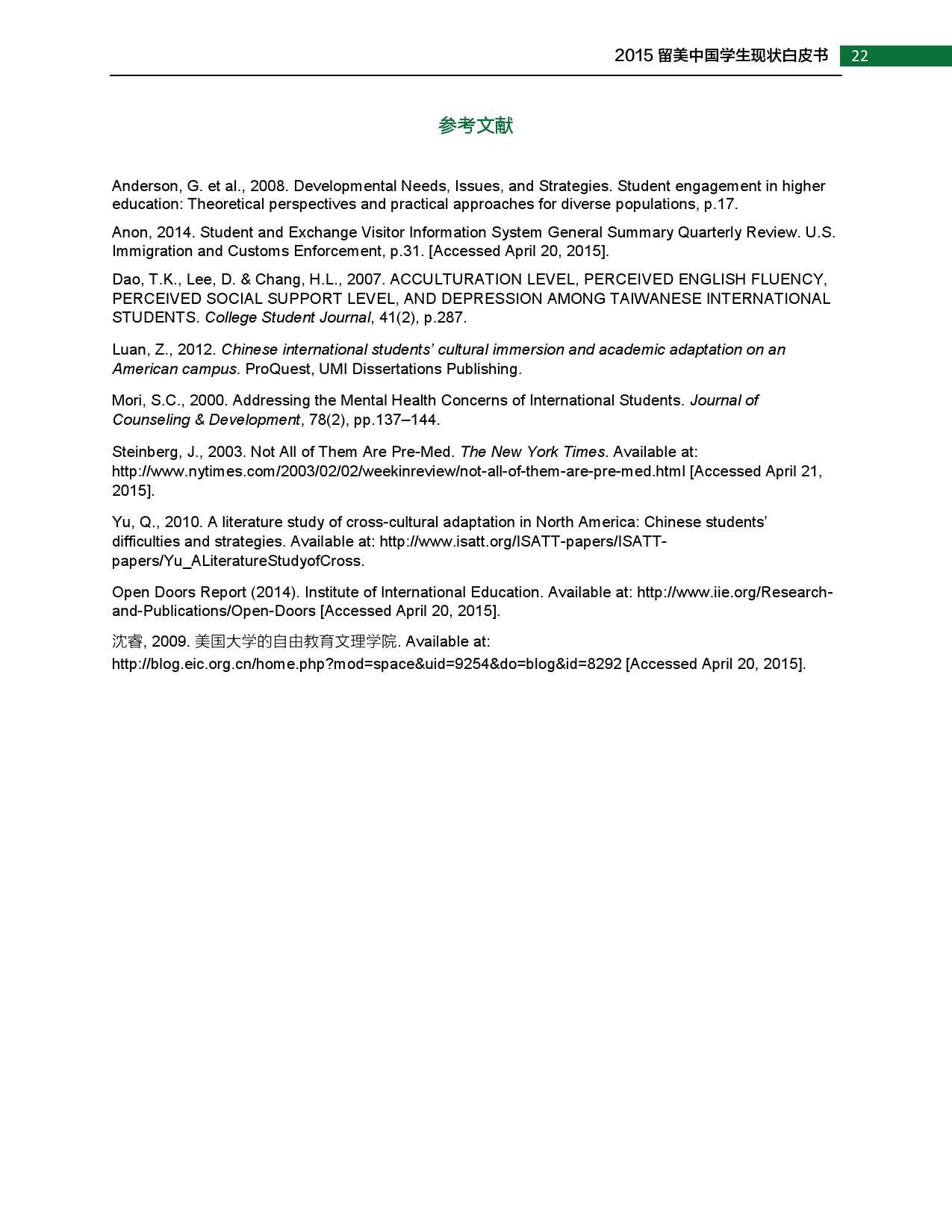 2015年留美中国学生现状白皮书 更多阅读:武书连:2015年中国大学排行榜2015年全球营养报告中怡康:2015年厨卫市场年中盘点联合国儿童基金会:2015年世界儿童状况西南财大&成都红娘:2015年成都婚恋调查2015年在线教育用户行为调查报告蚂蜂窝:2015年全球旅游购物报告阿里研究院:2015年网商发展研究报告世界银行:2015年世界发展报告中国信息通信研究院:2015年中国信息经济研究报告2015年中国专有云发展调查报告2015年中国公共云服务发展调查清研智库:2015年网络视频校园用户行为调查2015年生活服务类移动应用白皮书2015年上半年京东智能硬件行业报告(PPT完整版)