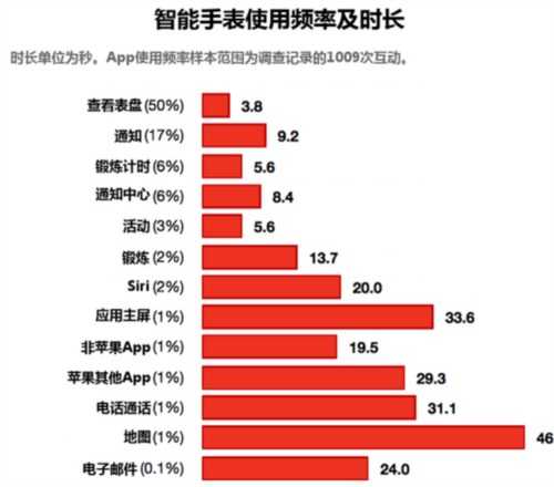 斯德哥尔摩大学的研究也支持了Wristly的报告,发现有半数互动只是单纯地看看表盘(平均3.8秒),查看通知占比为23%,与各种活动有关的行为占比为11%。Siri则位列第四,在所有互动中占比2%。阅读电子邮件的比例仅为0.1%。