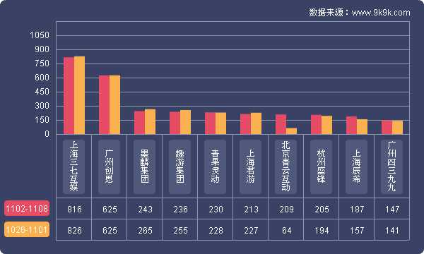 点评:本周网页游戏研发商排行前三未发生变化:上海三七互娱、广州创思、墨麟集团;新增上榜研发商北京青云互动,旗下代表作为《我是大主宰》,其发展趋势强劲。本周开服前三研发商共开服1684组,占榜单开服总数54.1%。