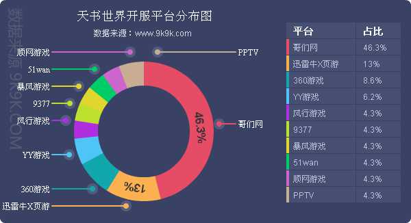 点评:本周《天书世界》在哥们网开服占比为46.3%,较上周增加了6.6%;同时迅雷牛X页游调整《天书世界》开服频率,调整后为3服/天。新增占比平台风行游戏、暴风游戏、51wan、PPTV,开服频率均为1服/天。