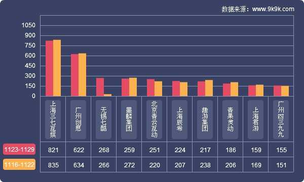 点评:本周最新网页游戏研发商开服排行前三为上海三七互娱、广州创思、无锡七酷,其中无锡七酷旗下新作《传奇盛世》近期发展形势良好;上海辰希本周排名上升至第六。本周开服前三研发商共开服1711组,占榜单开服总数54.1%,该占比较上周减少了0.9%。