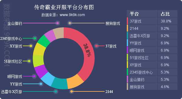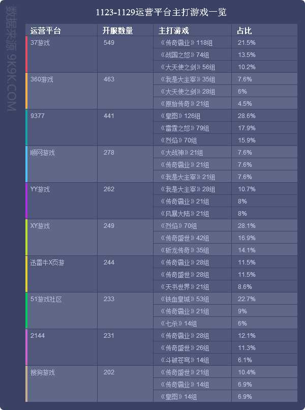 点评:本周37游戏略有下调《传奇霸业》的开服频率,开服占比减少1.3%,依然占据分布比例绝对优势。在其他平台的开服情况均较为稳定。