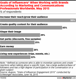 虽然意见领袖在和品牌合作时寻求创作自由和尊重,但是全球营销和传播专业人士认为利用意见领袖最主要的目的是增加接触的受众数量(2015年5月 Augure 和 Schlesinger Associates的调查)。不足一半的受访者表示给受众创作优质内容是品牌和意见领袖合作的目的之一。29%的受访者表示塑造品牌形象是意见领袖营销的目的。