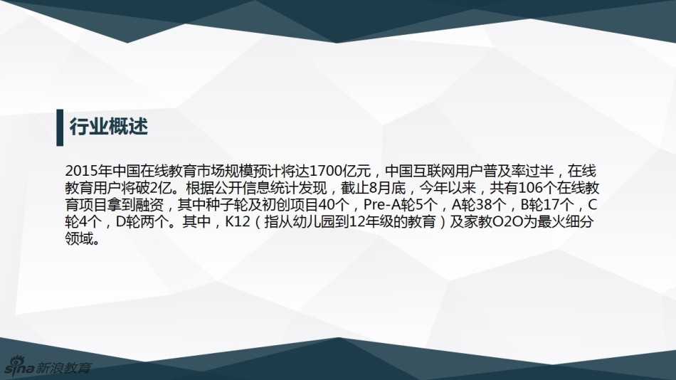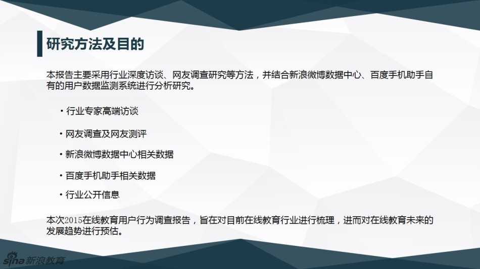 2015年在线教育用户行为调查报告 2015年,在线教育在迎来发展拐点。新浪教育频道联合新浪大数据中心及百度应用市场发布《在线教育用户行为研究报告》探索其在洗牌年里的蜕变与转型。 更多阅读:CBME:2015年中国孕婴童产业调查报告中国科学院:中国K12在线教育市场调研及用户消费行为报告十目监测:2021年Q1在线教育行业户外广告投放研究报告Fastdata极数:2020年中国K12在线教育行业报告热云数据:2019年第一季度在线教育App投放行为洞察报告2015年仅5%在线教育企业盈利 80%项目将死去一位产品经理的“在线教育行业调研分析报告”网易有道:1Q21总营收13亿元 同比增长147.5%七麦研究院:2021年4月在线教育热门App排行榜中国网络视听协会:2025年1-8月上线竖屏剧14万部Apptopia:2025年ChatGPT应用增速放缓QuestMobile:2025年上半年中国移动互联网月活12.67亿CIRP:2025年40%用户因旧iPhone问题换新机《2025年中国睡眠健康调查报告》:2025年中国成年人平均23时15分入睡智联报告:2025年职场女性平均月薪8978元 男性平均月薪10320元