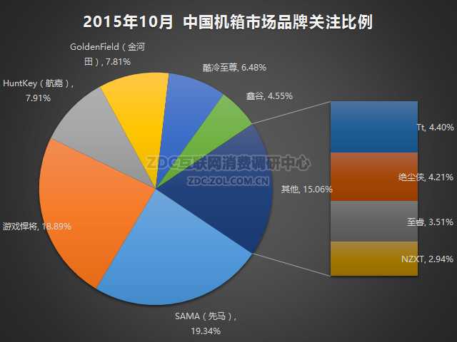 2015年10月中国的机箱市场上,品牌竞争异常激烈。先马以19.34%的关注比例夺冠,游戏悍将以18.89%的关注度占比紧随其后,二者领先优势明显。航嘉的关注比例为7.91%排名第三,其关注度只比第四的金河田高0.1%。酷冷至尊的关注比例为6.48%,鑫谷的关注度占比为4.55%。其它热门品牌还有Tt、绝尘侠、至睿和NZXT,关注比例都在2.94%-4.40%之间。