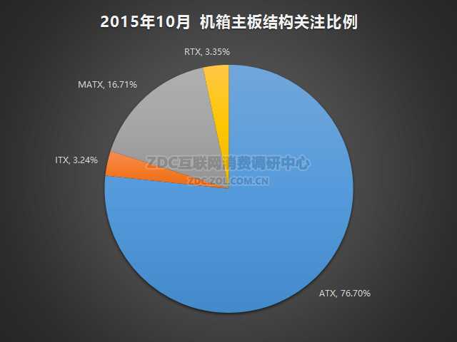 2015年10月中国的机箱市场上,机箱主板结构为ATX的产品关注比例最高,达到了76.70%,MATX的关注度占比为16.71%,RTX的关注比例为3.35%,ITX的关注度占比为3.24%。