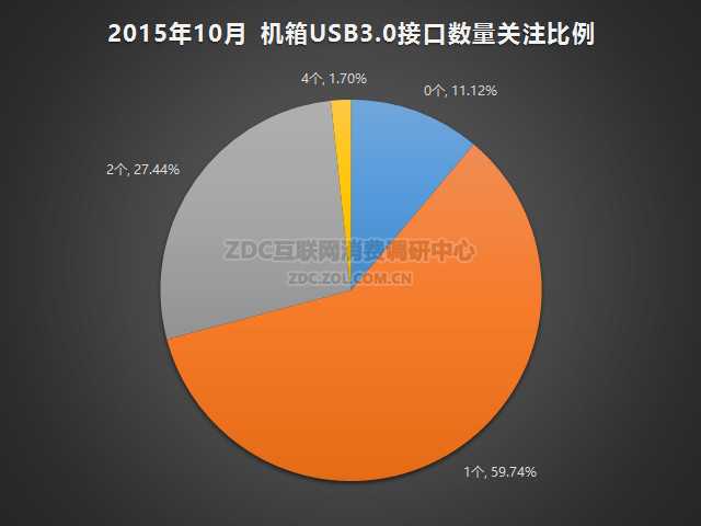 ZDC数据显示,2015年10月中国的机箱市场上,没有USB 3.0接口的产品关注比例只有11.12%,包含1个USB 3.0接口的产品关注度占比为59.74%,有2个USB 3.0接口的产品关注比例为27.44%,4个USB 3.0接口的产品关注度占比为1.70%。