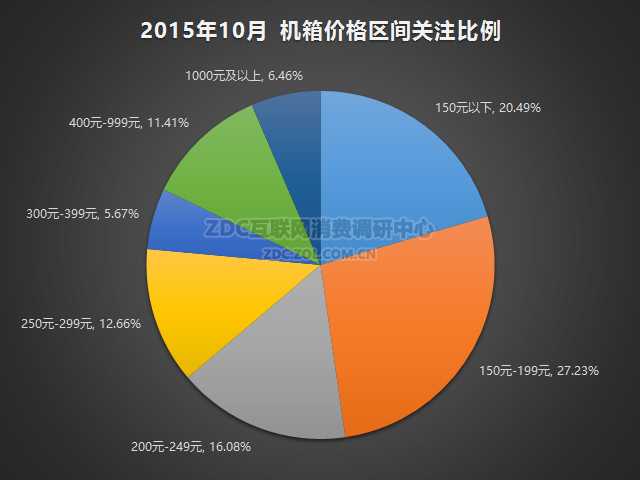 ZDC数据显示,2015年10月中国的机箱市场上,150元以下的产品关注度比例为20.49%,150元-199元产品的关注度比例为27.23%,200元-249元产品关注度占比为16.08%,250元-299元产品的关注比例为12.66%,300元-399元占比5.67%,400元-999元占比11.41%,1000元以上的产品关注比例为6.46%。