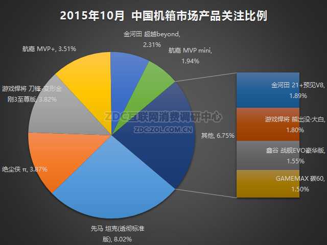 2015年10月中国的机箱市场上,先马 坦克(透彻标准版)吸引了8.02%的市场关注度,成为最热门产品。绝尘侠π的关注度占比3.87%排名第二,游戏悍将 刀锋-变形金刚3至尊版占比3.82%紧随其后,航嘉 MVP+占比3.51%排名第四。第二到第四的热门产品之间差距只有0.36%,十分微弱。其它热门产品所属的品牌分别为金河田、航嘉、游戏悍将、鑫谷以及GAMEMAX,关注比例在1.5%-2.31%之间。