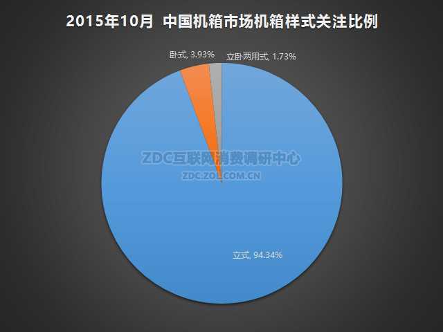 ZDC数据显示,2015年10月中国的机箱市场上,立式机箱凝聚了94.34%的关注比例,是目前市场的绝对主流产品,卧式机箱的关注度占比为3.93%,立卧两用式机箱占比为1.73%。