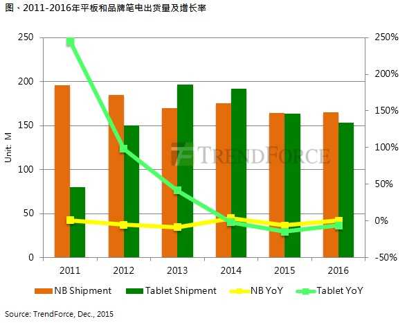 至于平板电脑2016年出货衰退态势不变。王靖怡表示,平板电脑市场持续受大尺寸手机侵蚀,即使新产品如苹果的iPad Pro成功开拓商务市场,仍因属于高单价产品,依旧难弥补小尺寸平板出货流失缺口。TrendForce预估2016年平板电脑出货量约1.534亿台,年衰退6.1%。