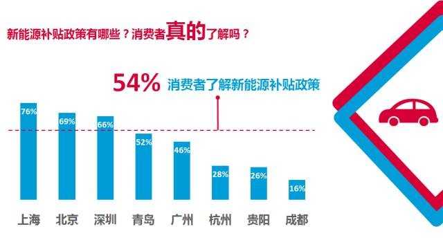 2015年上半年间,先后有10个以上与新能源汽车相关的行业政策和行业标准出台或实施。新能源汽车示范城市增至89个,电动汽车的价格补贴也开始逐步推广。然而,尼尔森报告显示,新能源汽车补助政策的总体知晓比例并不高,仅有53.9%,只有上海、北京、深圳三个一线城市超过这一平均水平,而其它接受调研的城市如杭州、贵阳和成都则介于16%—28%之间。实际上,消费者对新能源汽车的购买意向与他们对补贴政策的知晓度多少是高度关联的。在了解新能源汽车补助政策的消费者中,57%愿意考虑购买新能源车,而这个比例在不知道补助政策的人中仅有38%。