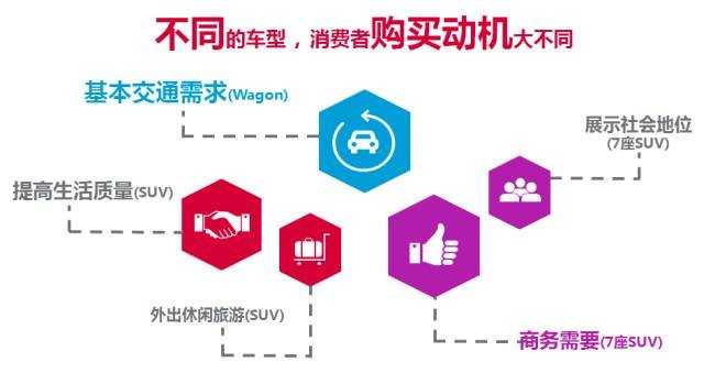 消费者在购买汽车的过程中,不仅会对各个车型有所理解,同时也会针对各个车型拥有着不同的购买动机。目前,消费者购买旅行车的动机仍是为了解决基本的交通需求,若是需要休闲出游或是实现生活水平的提升,更多消费者会去选择购买SUV。选择购买7座SUV的消费者更多得是希望能通过汽车来展示自己的社会地位。