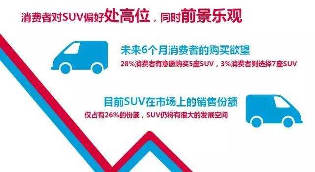 消费者到底想要购买哪一种车型?哪一款车型又将在未来受到追捧呢?调查发现,有28%的消费者在未来6个月中有意向购买5座SUV,3%的消费者选择了7座SUV,与目前SUV在市场上26%的实际的消费份额相比,不难发现,SUV仍在未来有很大的发展空间。