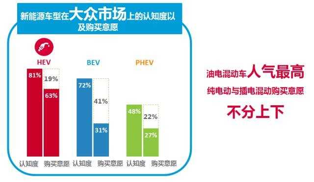 当然,就目前的市场,消费者对不同新能源车类型的认知度和购买考虑也是不同的。混动车的认知度和购买考虑度最高。纯电动车虽然比插电混动在认知度上高很多,但就购买考虑度而言,二者并没有相差甚多。