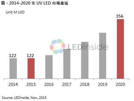 LEDinside研究副理吴盈洁表示,尽管今年整体UV-A LED市场价格快速跌落,厂商仍乐观认为适度跌价代表市场正在起飞。未来两年厂商将力求技术发展,计划跨入UV-C LED(短波紫外线,280nm以下)利基市场。随着技术发展与客制化设计成为UV LED高毛利的蓝海市场利基,可望出现如深紫外短讯通讯等更宽广应用,因此LEDinside预估2020年UV LED市场产值将会达到3.56亿美元。