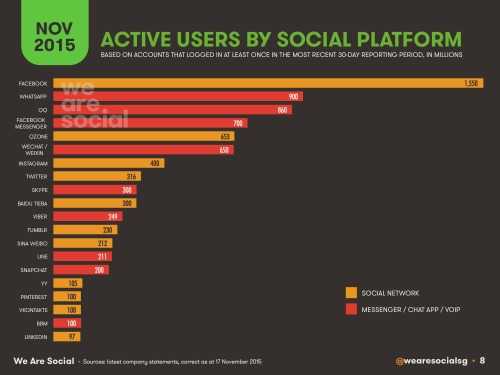 Facebook在其他地方也在持续增长,自2015年伊始超过1.80亿新注册用户。下图显示了全球最受欢迎的社交媒体平台,按照月活跃用户数量排序。