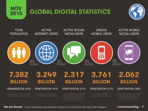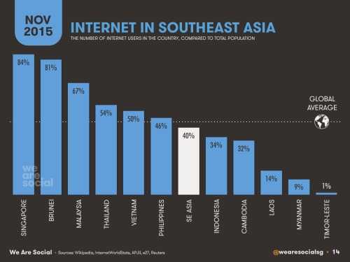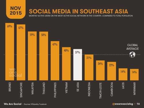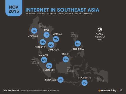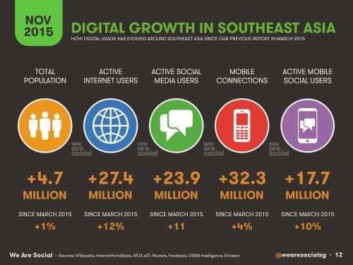 东南亚互联网增长没有放缓趋势,全球也如此。最新数据显示2015年新产生2.5亿网民,3.00亿社交媒体用户。