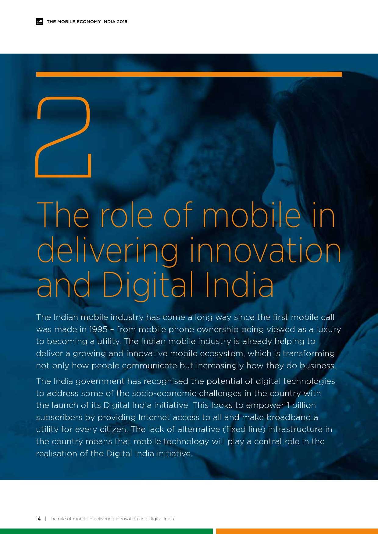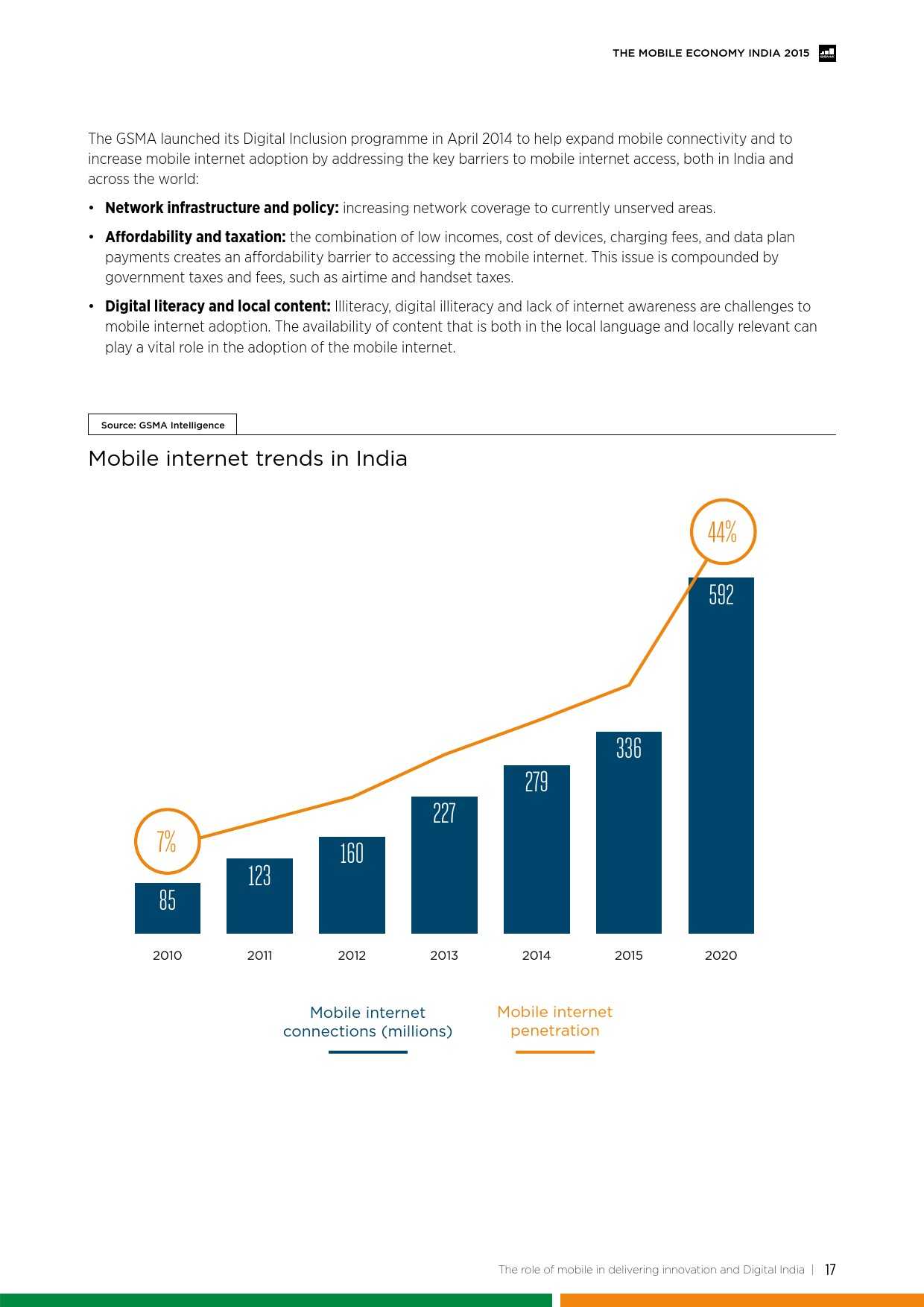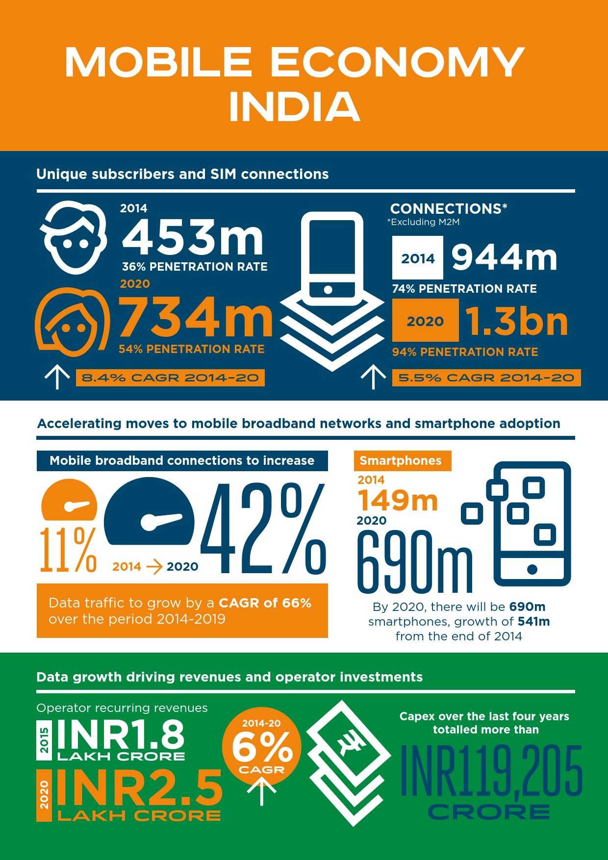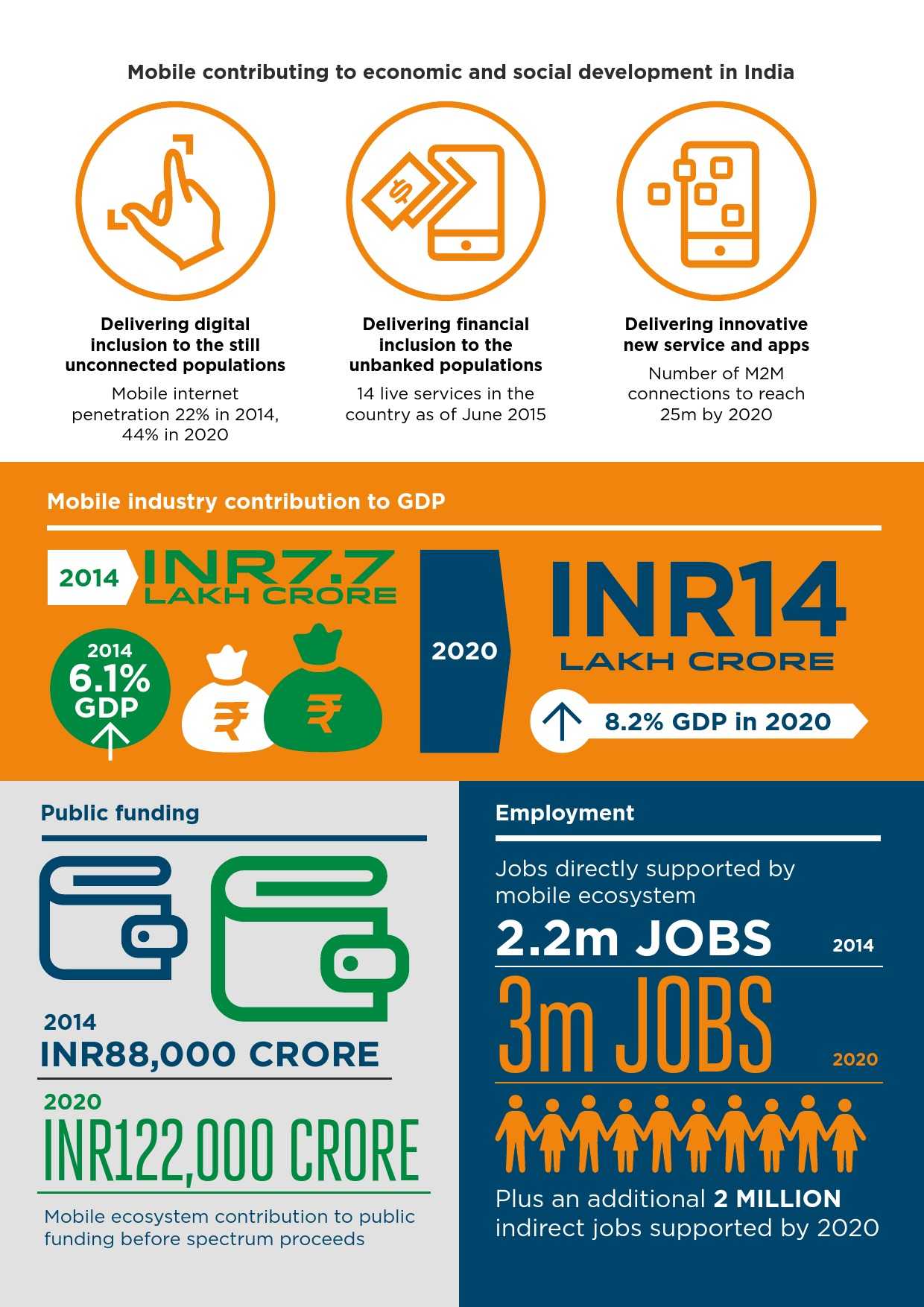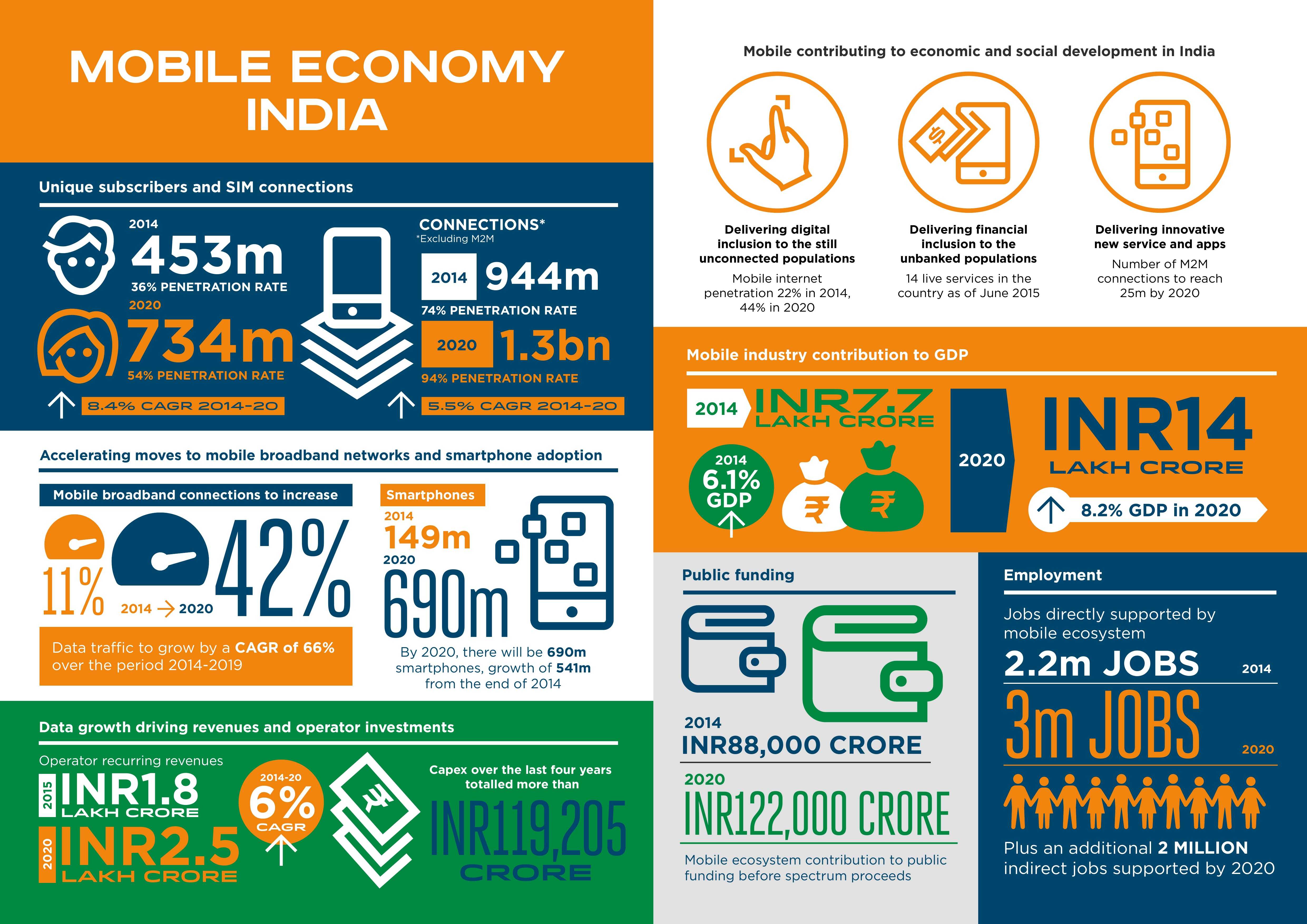 印度的移动产业在2015年7月推出的“数字印度”计划中起着重要的促成作用,该计划旨在将印度转变为数字授权社会,并提供宽带连接。由于固定基础设施在该国相对缺乏,移动领域已成为其互联网接入的主导平台。通过移动设备访问互联网的个人数量已从2010年的不到1亿用户上升到2014年底的近3亿用户。