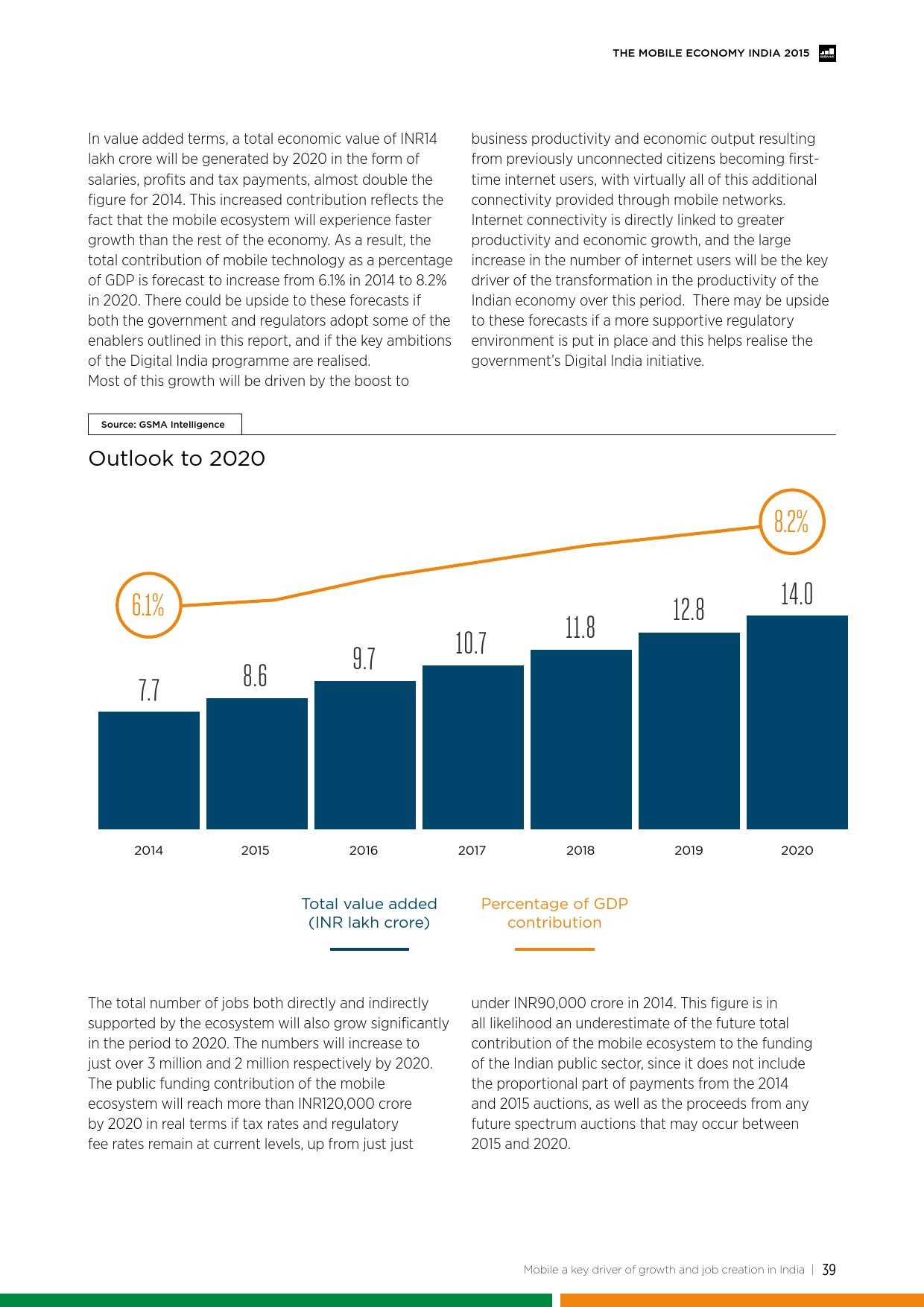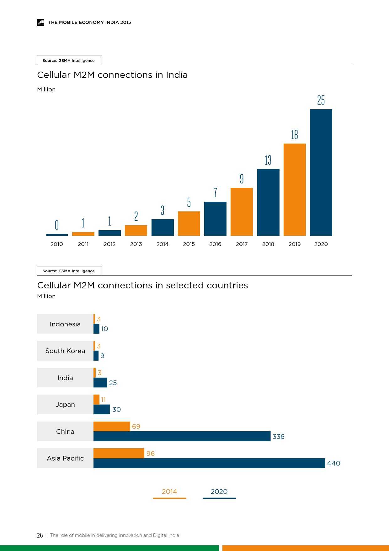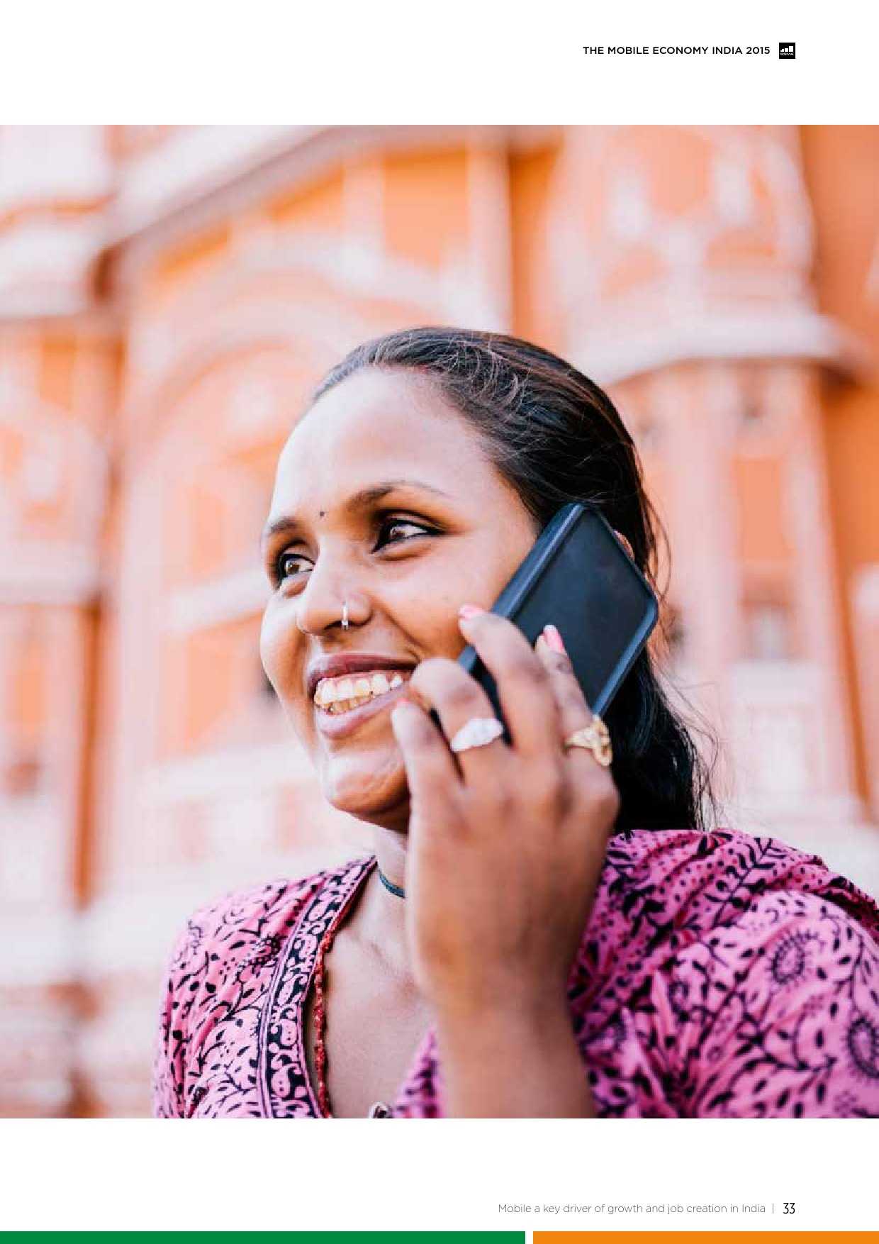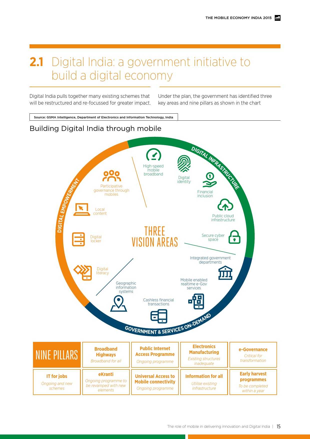印度的移动产业在2015年7月推出的“数字印度”计划中起着重要的促成作用,该计划旨在将印度转变为数字授权社会,并提供宽带连接。由于固定基础设施在该国相对缺乏,移动领域已成为其互联网接入的主导平台。通过移动设备访问互联网的个人数量已从2010年的不到1亿用户上升到2014年底的近3亿用户。