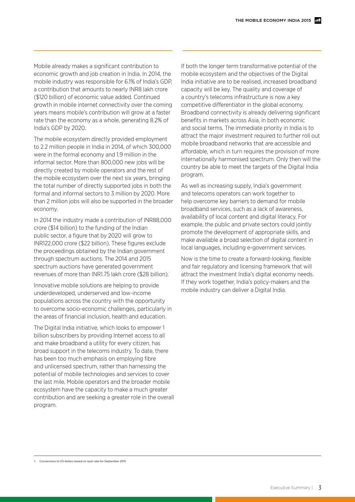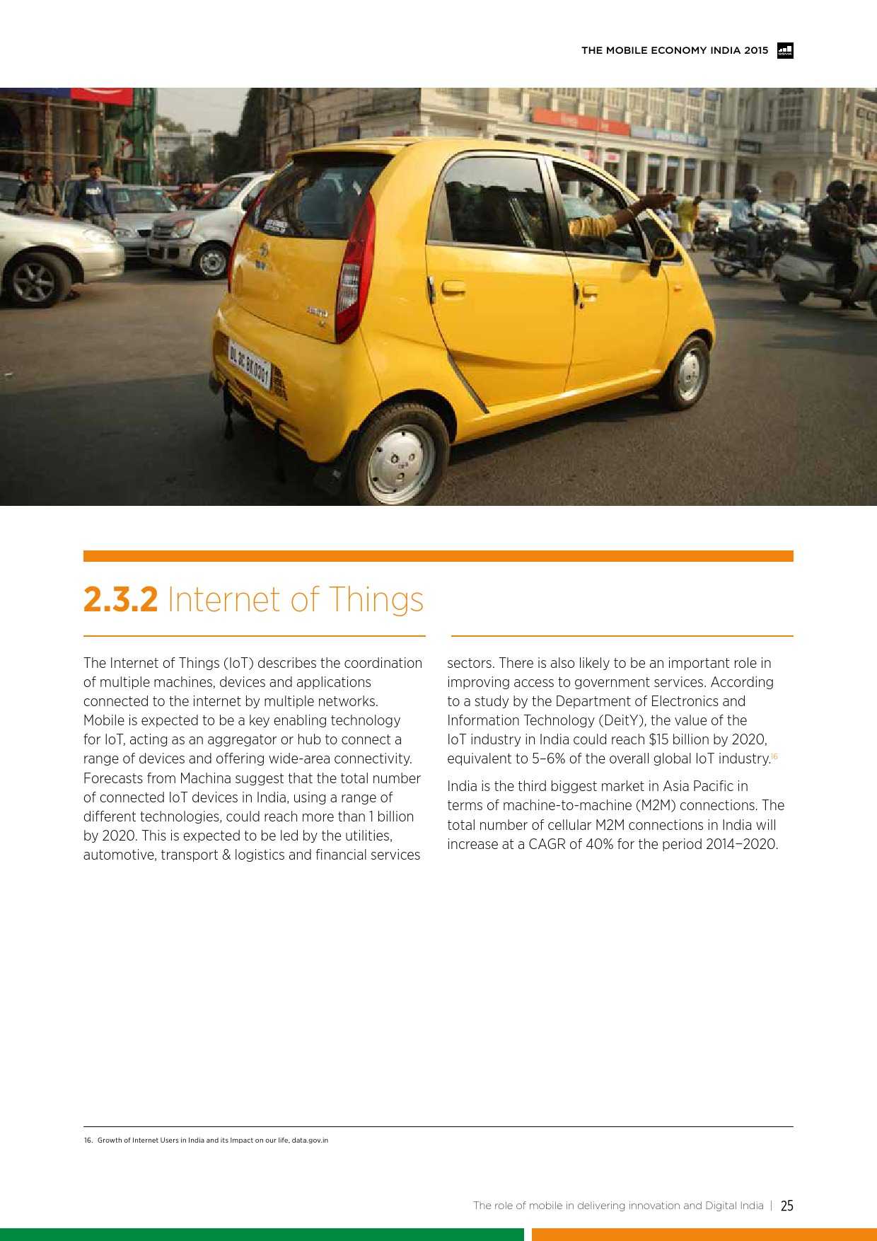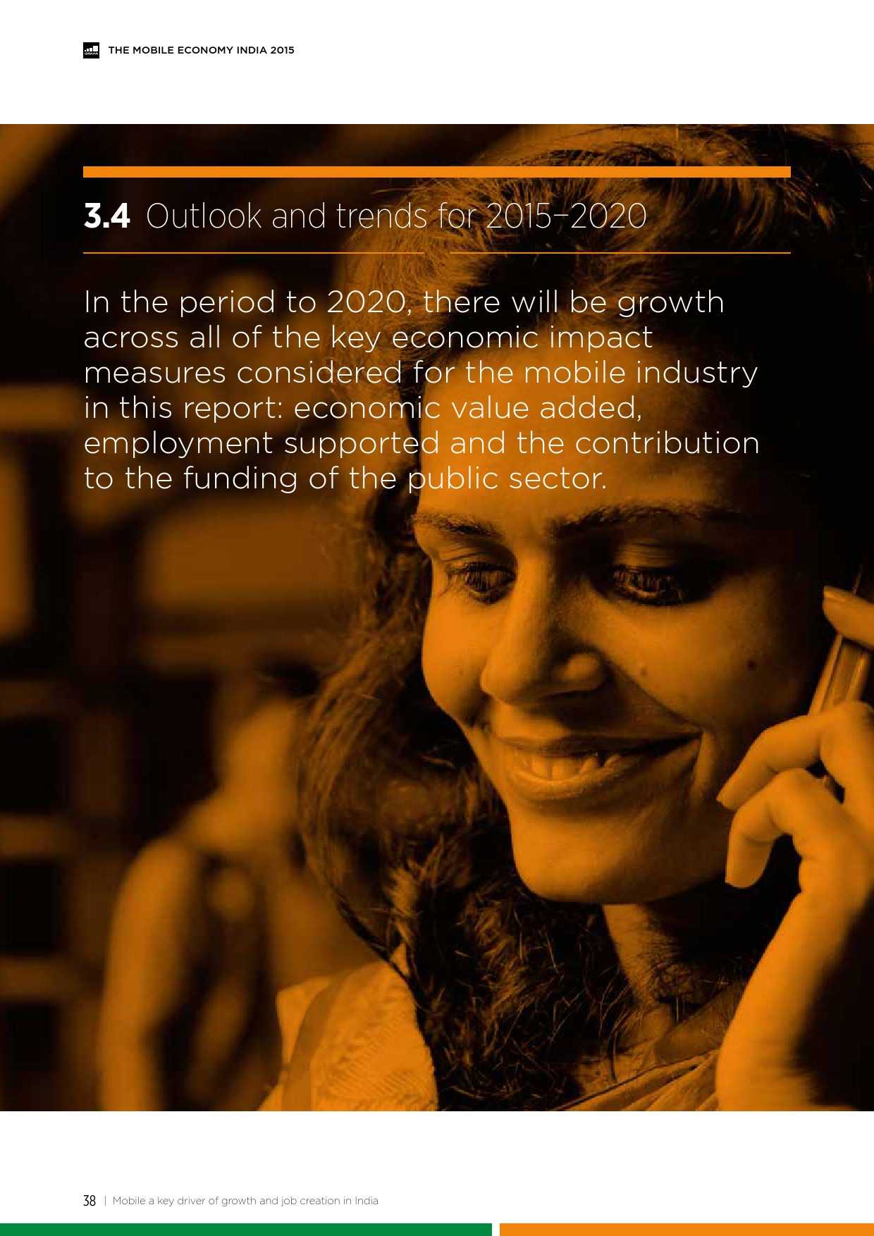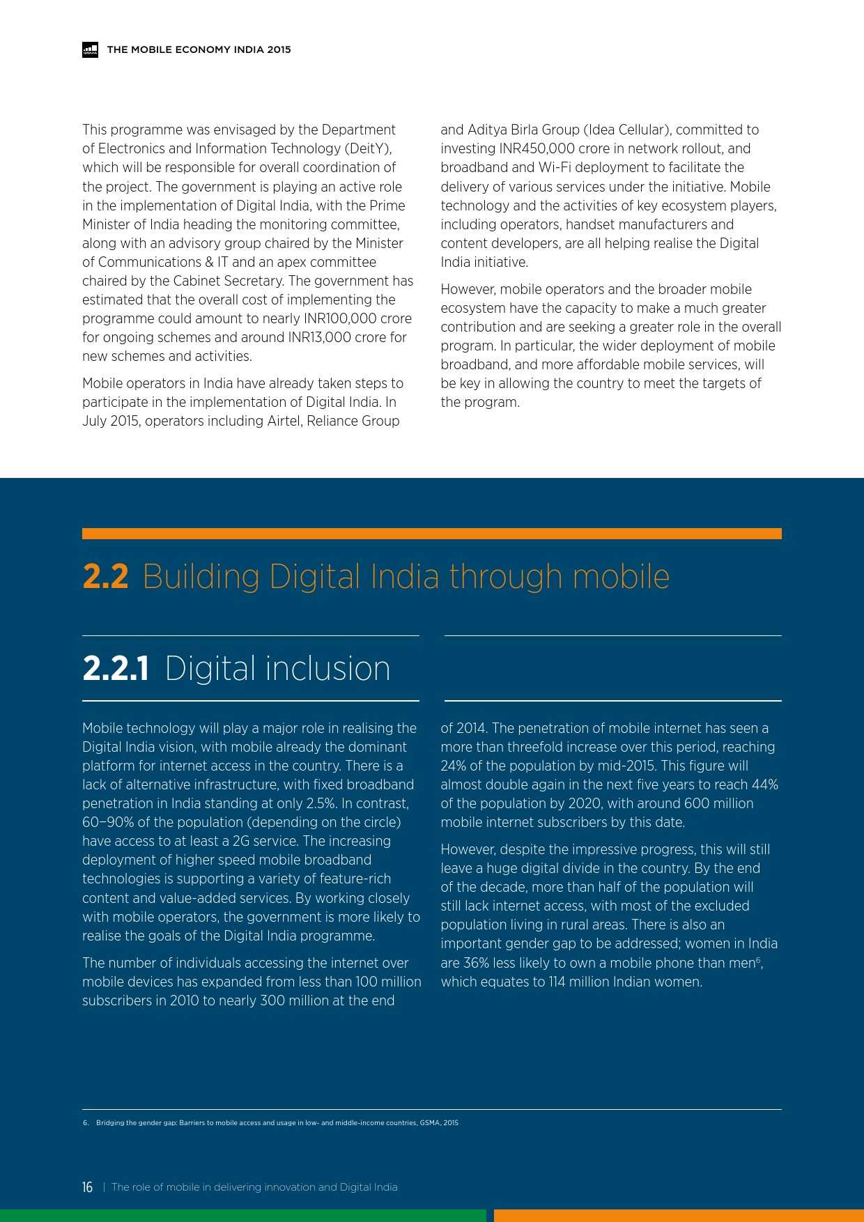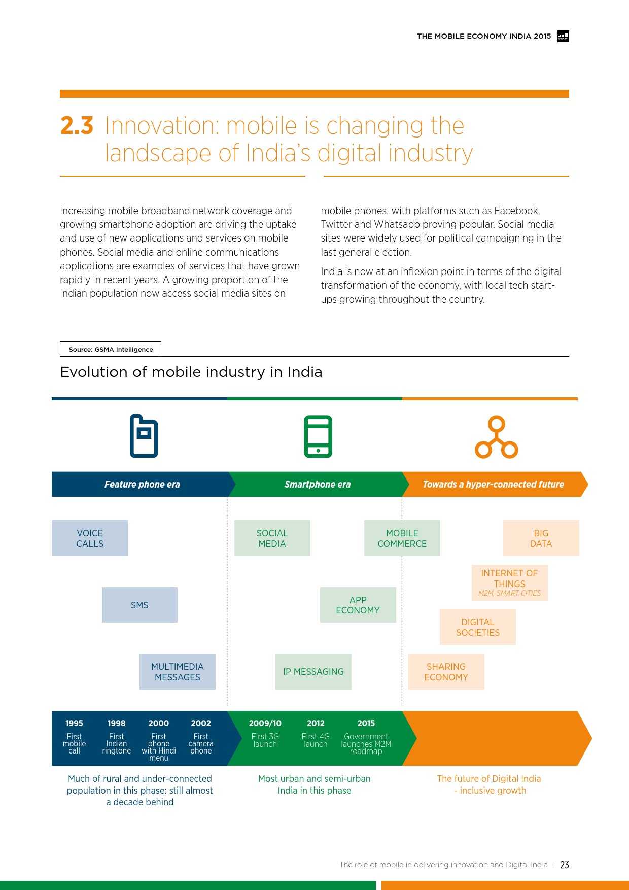印度的移动产业在2015年7月推出的“数字印度”计划中起着重要的促成作用,该计划旨在将印度转变为数字授权社会,并提供宽带连接。由于固定基础设施在该国相对缺乏,移动领域已成为其互联网接入的主导平台。通过移动设备访问互联网的个人数量已从2010年的不到1亿用户上升到2014年底的近3亿用户。