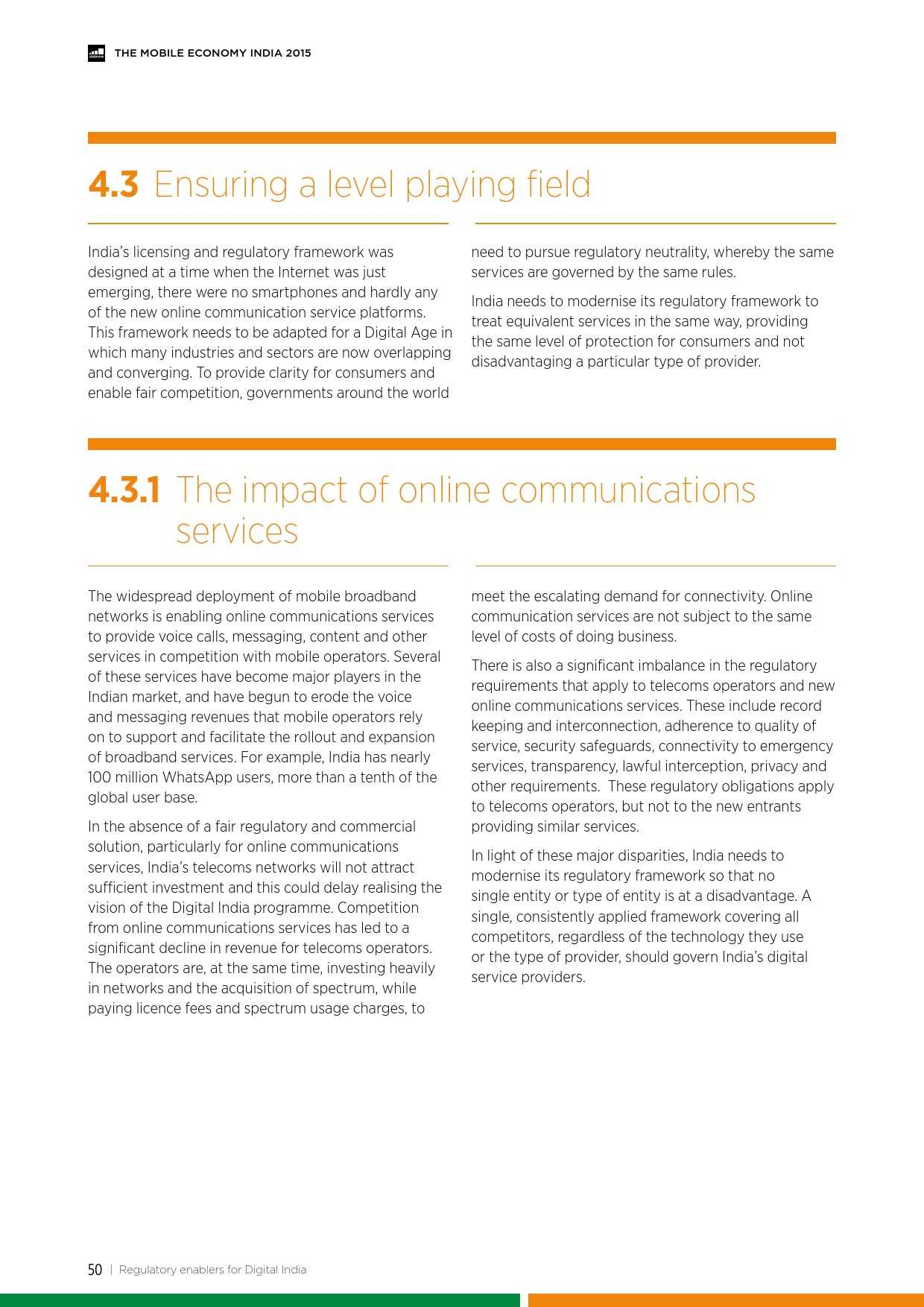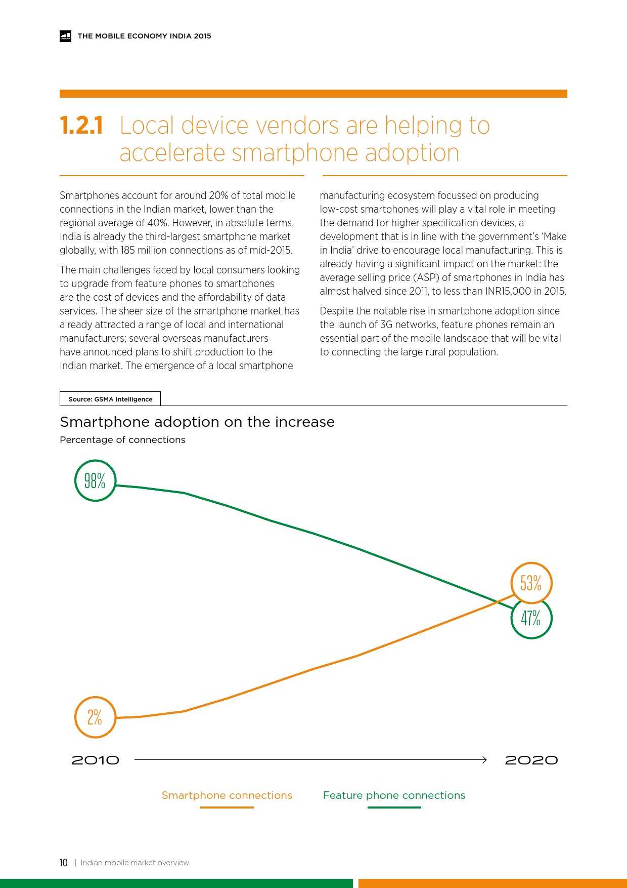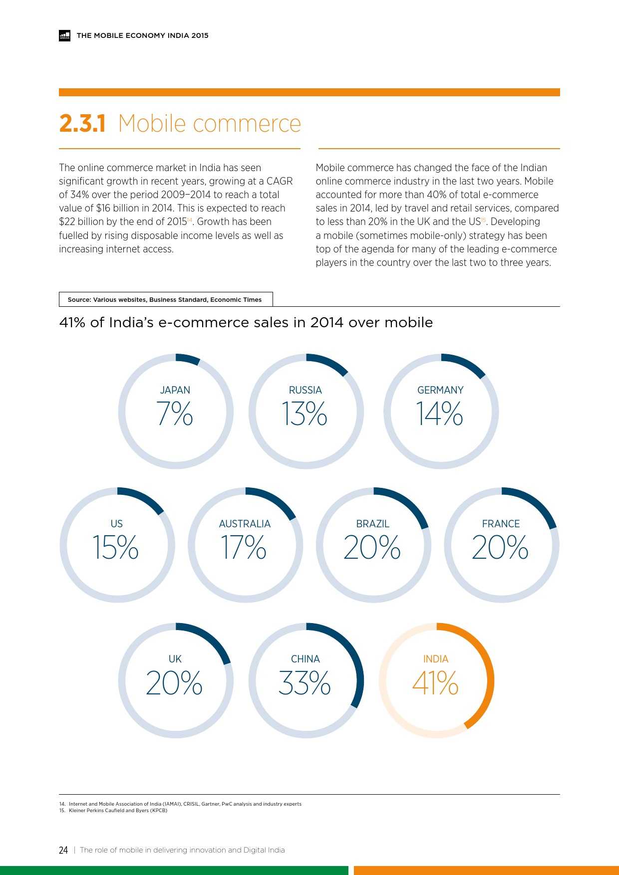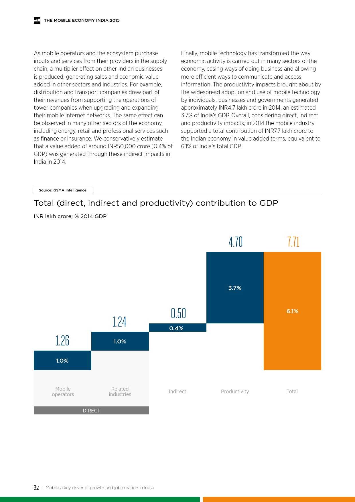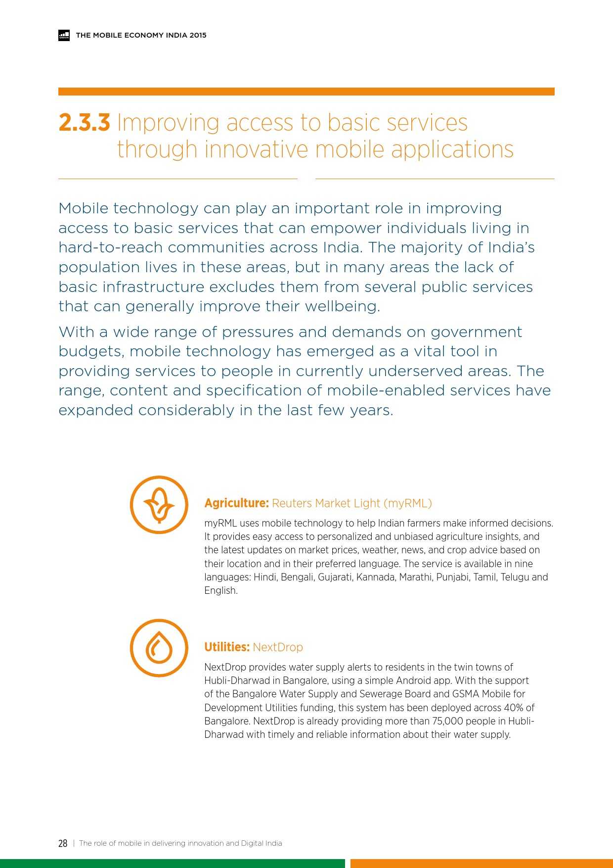 印度的移动产业在2015年7月推出的“数字印度”计划中起着重要的促成作用,该计划旨在将印度转变为数字授权社会,并提供宽带连接。由于固定基础设施在该国相对缺乏,移动领域已成为其互联网接入的主导平台。通过移动设备访问互联网的个人数量已从2010年的不到1亿用户上升到2014年底的近3亿用户。