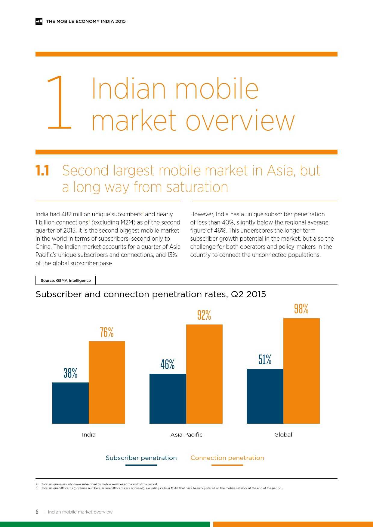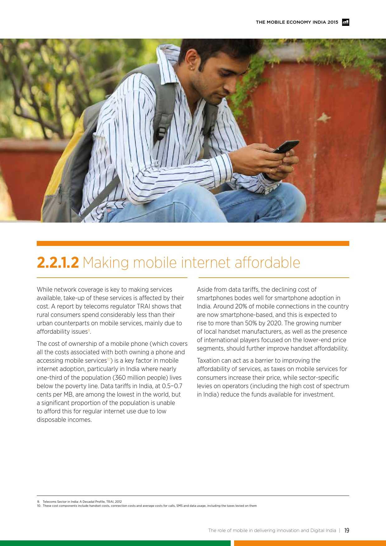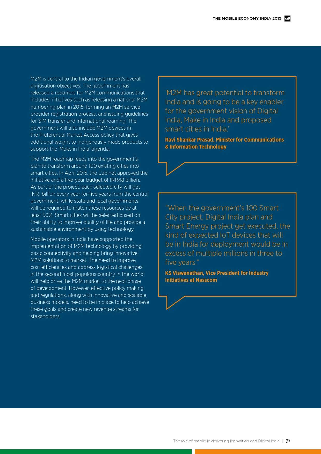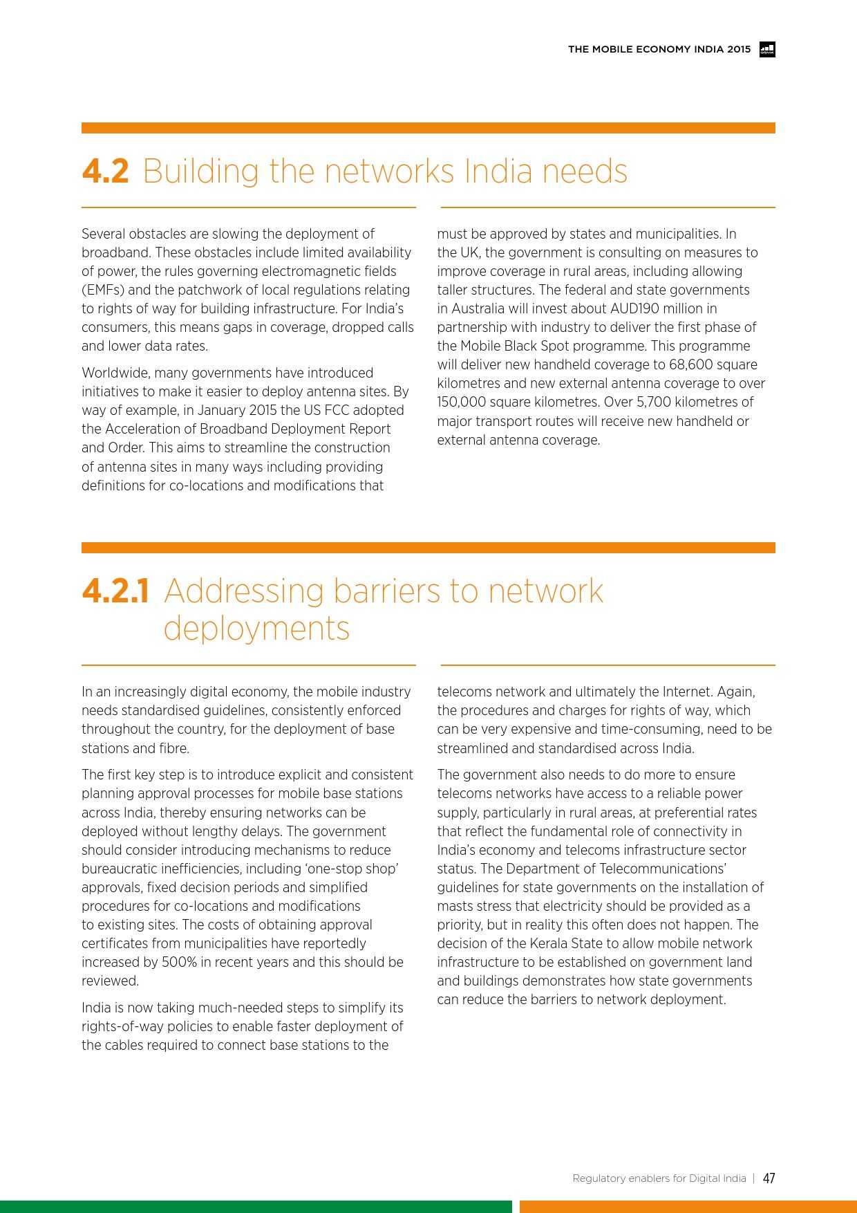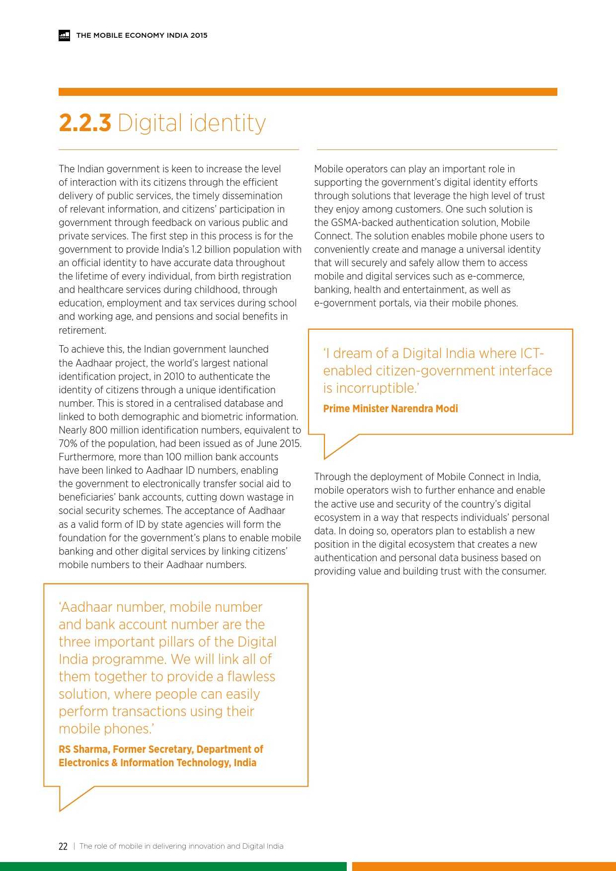 印度的移动产业在2015年7月推出的“数字印度”计划中起着重要的促成作用,该计划旨在将印度转变为数字授权社会,并提供宽带连接。由于固定基础设施在该国相对缺乏,移动领域已成为其互联网接入的主导平台。通过移动设备访问互联网的个人数量已从2010年的不到1亿用户上升到2014年底的近3亿用户。