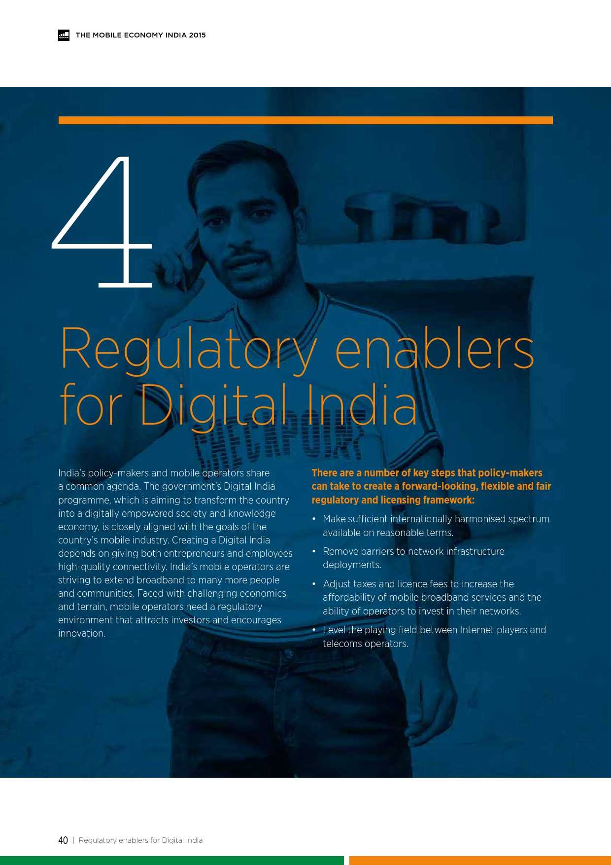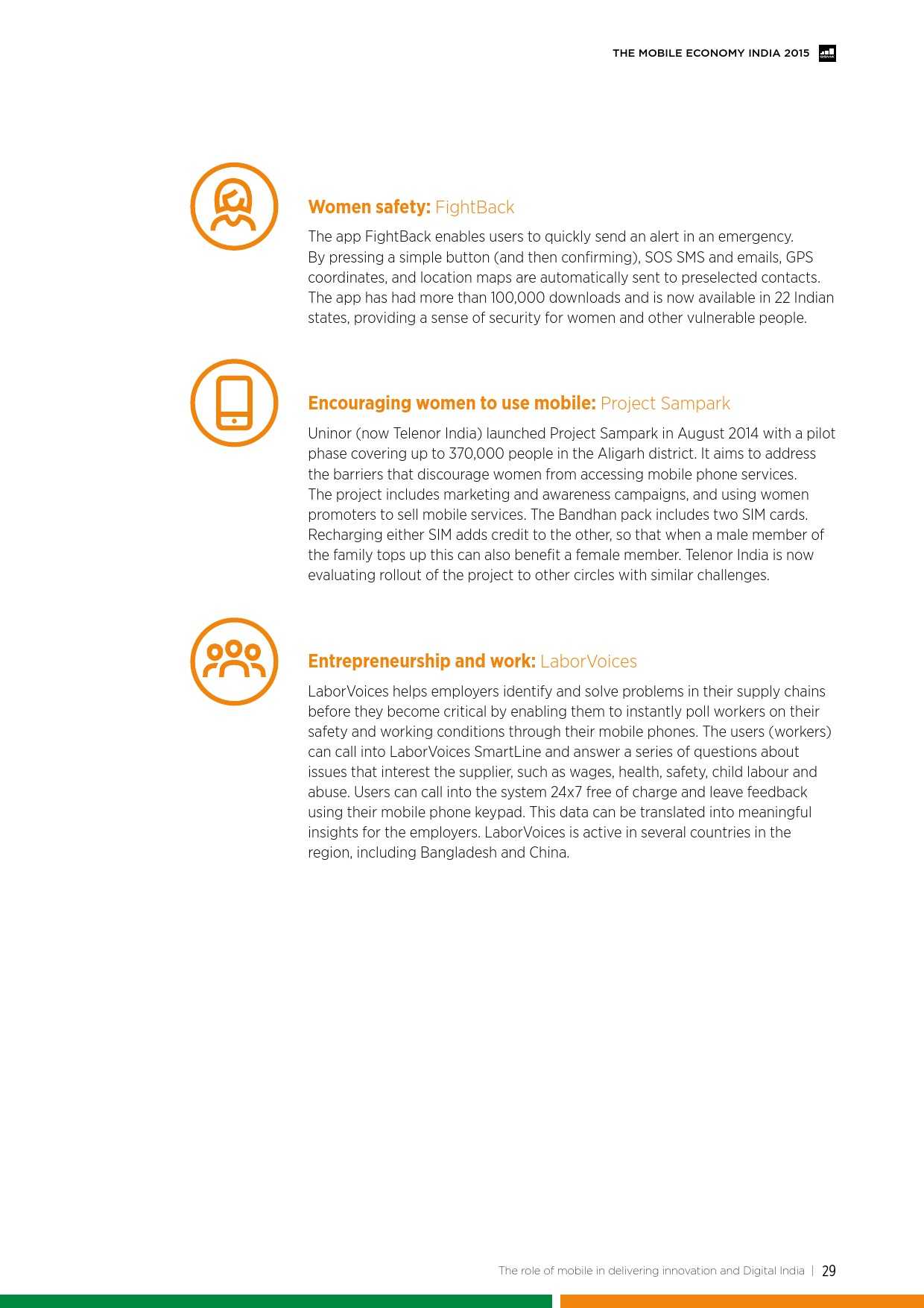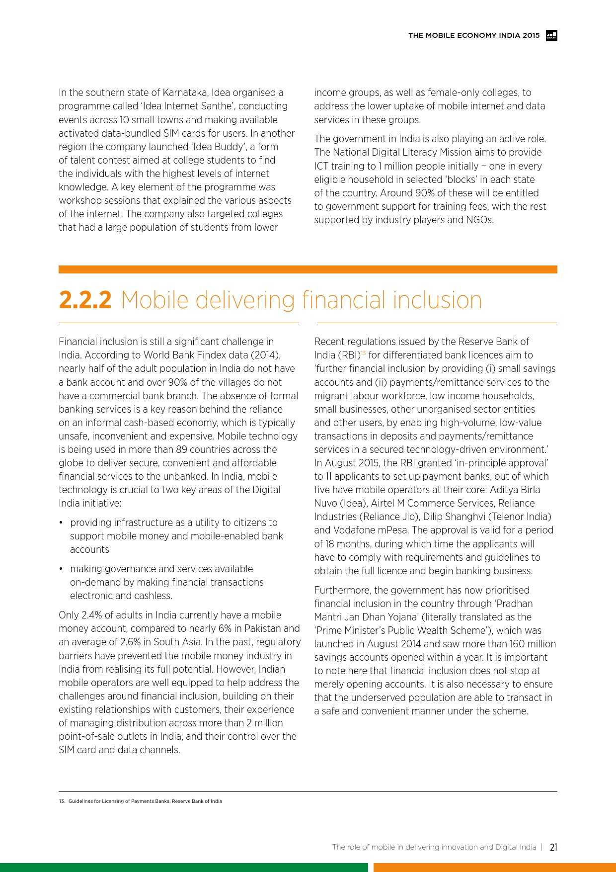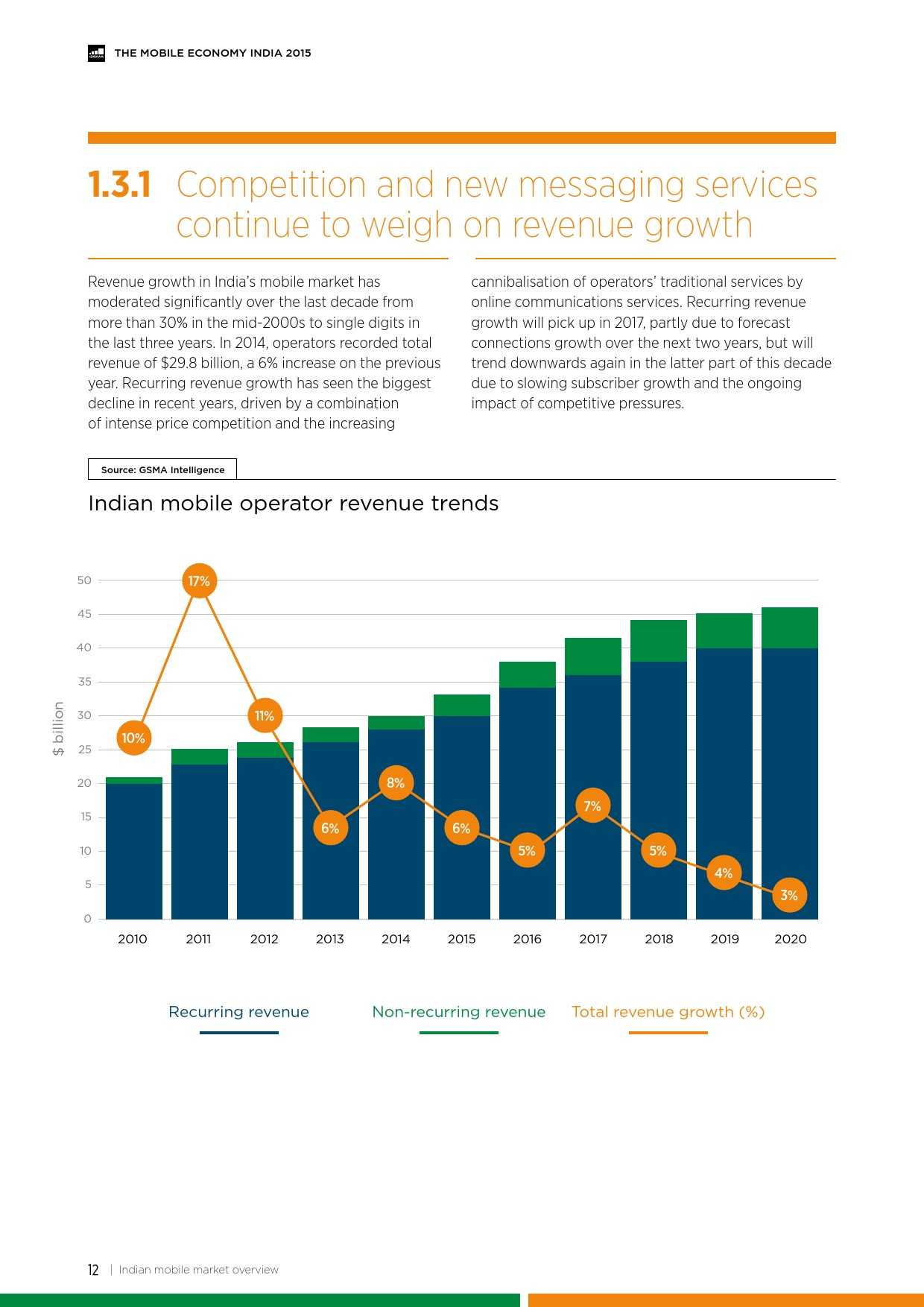 印度的移动产业在2015年7月推出的“数字印度”计划中起着重要的促成作用,该计划旨在将印度转变为数字授权社会,并提供宽带连接。由于固定基础设施在该国相对缺乏,移动领域已成为其互联网接入的主导平台。通过移动设备访问互联网的个人数量已从2010年的不到1亿用户上升到2014年底的近3亿用户。