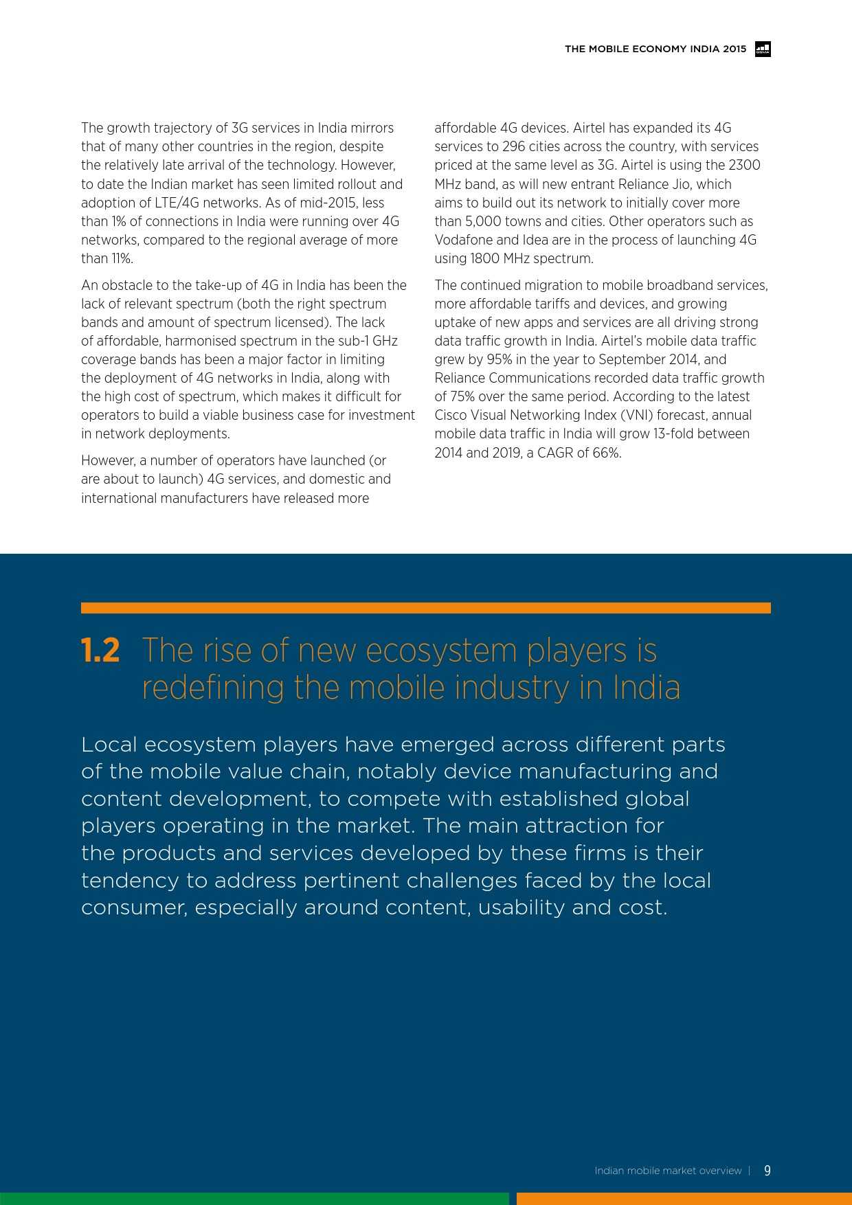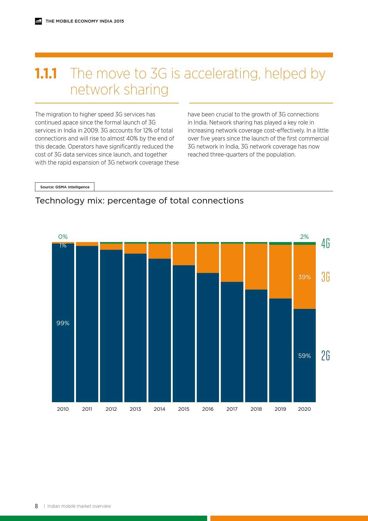 尽管印度只在2009年推出3G服务及4G部署处于早期阶段,但未来几年,该国将加快向移动宽带网络的迁移步伐。2014年,移动宽带网络(3G/4G)仅占印度移动连接1的11%,然而,到2020年这一数字预计将达到总连接数的42%。自推出首个商用3G网络以来的五年多时间里,印度移动运营商已将3G网络覆盖范围扩大到涵盖该国四分之三的人口。