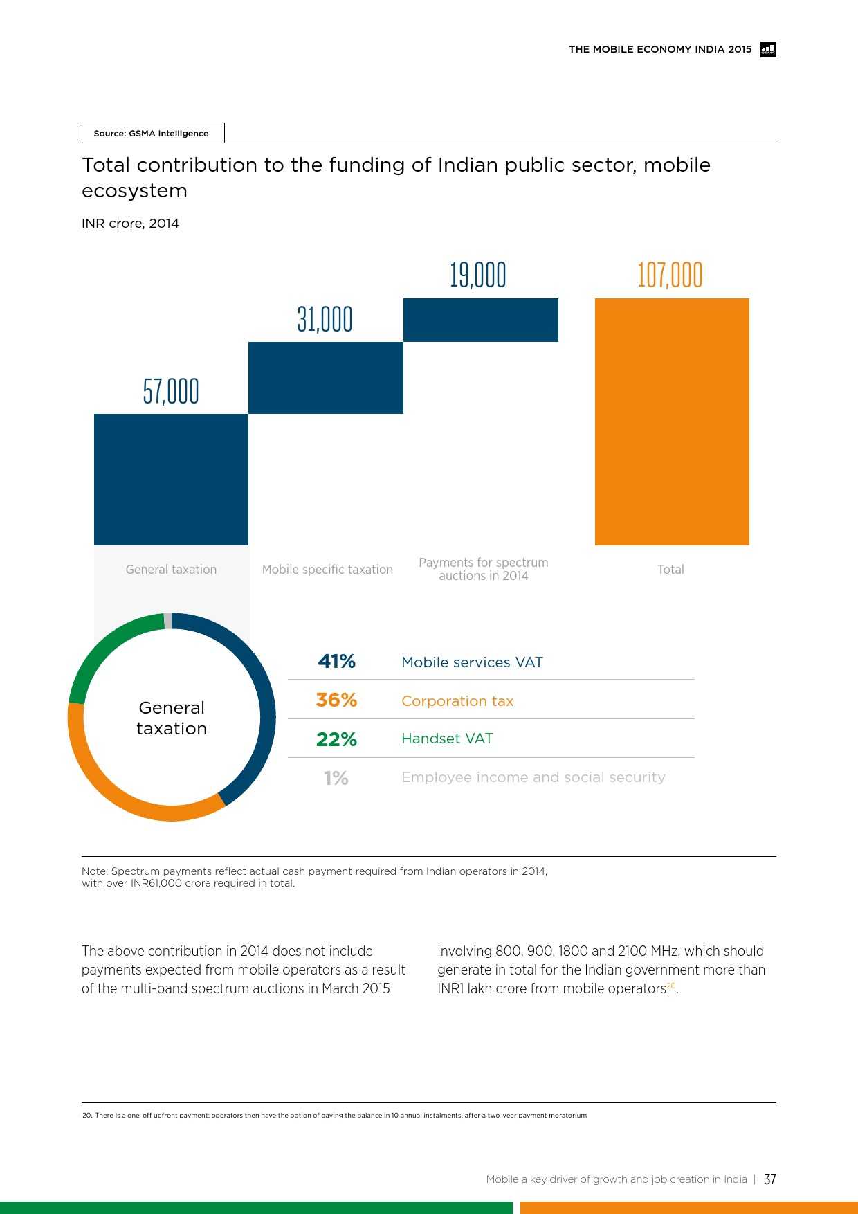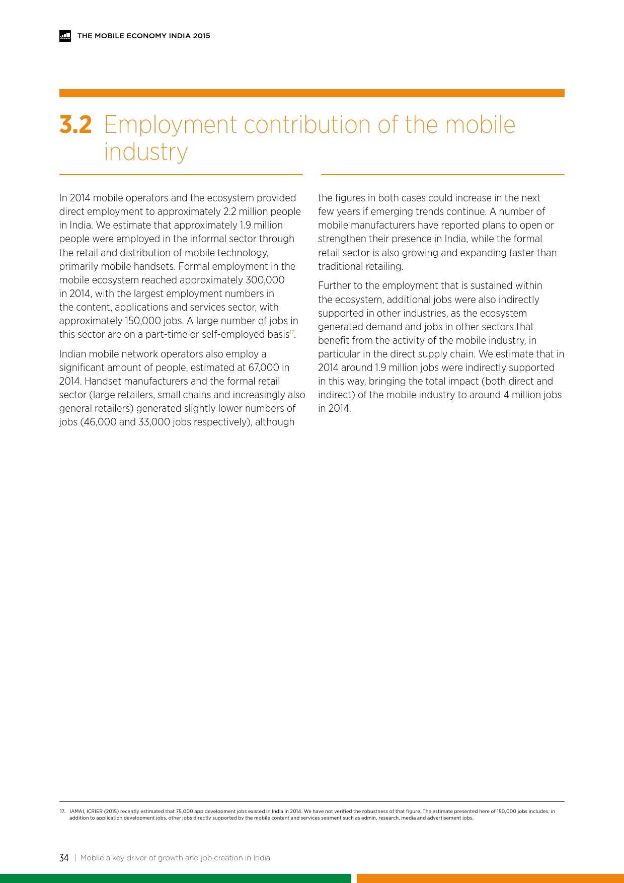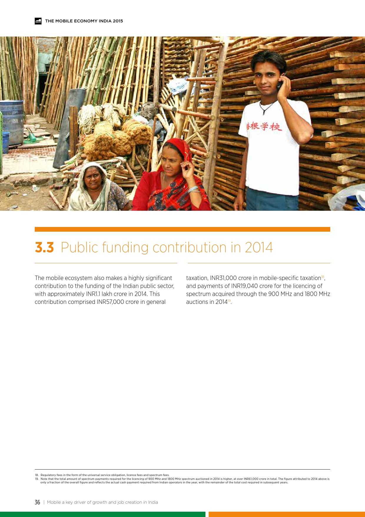 印度的移动产业也是推动经济增长和创造就业的重要因素。2014年,该产业为印度经济做出了7.7万亿印度卢比(约1,160亿美元)的总贡献,相当于印度国内生产总值(GDP)3的6.1%。到2020年,这一贡献数字预计将翻番,达到14万亿印度卢比,将占届时该国预计GDP的8.2%。2014年,移动产业直接或间接为印度经济提供了400万个就业岗位,到2020年这一数字预计将上升到500万。此外,这也为印度公共部门的经费做出重大贡献,2014年以税收和频谱拍卖支付形式贡献了约1.1万亿印度卢比(约160亿美元)的资金。