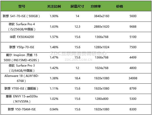 ZDC数据显示,2015年11月中国的笔记本电脑市场上,十大热门产品竞争异常激烈。最热门产品与排名第十的产品之间只有0.96%的差距。其中,联想 S41-70-ISE(500GB)以1.90%的关注比例夺冠,微软 Surface Pro 4的关注比例为1.57%,排名第二;华硕 FX50JK4200的关注比例为1.57%,排名第三。联想 Y50p-70-ISE以1.48%的关注比例只比戴尔 Inspiron 灵越 15 5000高0.01%获得第四。第6-10位的产品为微软 Surface Pro 3、Alienware 18、联想 Y700-ISE、惠普 ENVY 15-ae020tx和联想 Y50-70AM-ISE,关注比例在0.94%-1.42%之间。