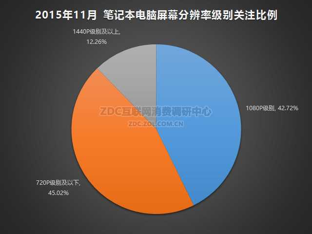 2015年11月中国的笔记本电脑市场上,屏幕分辨率1080P级别的产品的关注比例为42.72%,720P级别及以下占比45.02%,1440P级别及以上的产品关注比例iwei12.26%。