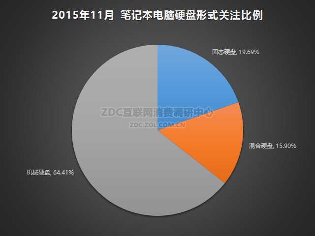 ZDC数据显示,2015年11月中国的笔记本电脑市场上,使用机械硬盘的产品依然最为普遍,关注比例高达64.41%,随着其它类型硬盘的发展,面临着很大的挑战。固态硬盘和混合硬盘的关注比例分别为19.69%和15.90%。