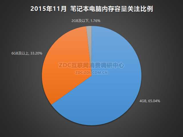从11月的数据可以看出,4GB的内存容量为目前市场的绝对主流,关注的用户比例达到65.04%,其次是6GB及以上的33.20%,2GB及以下占比1.76%。