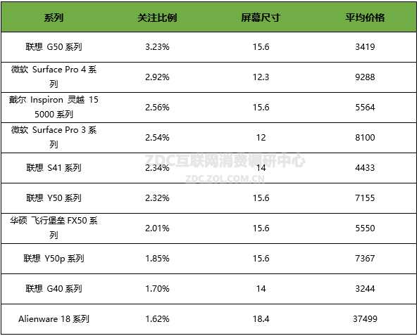2015年11月,中国笔记本电脑市场上十大热门系列的差距非常小,联想 G50 系列以3.23%的关注比例成为最受欢迎的笔记本系列。其次,微软 Surface Pro 4 系列的关注度为2.92%,戴尔 Inspiron灵越 15 5000系列的关注度占比为2.56%,微软 Surface Pro 3系列的关注度占比为2.54%,联想 S41系列产品关注度占比2.34%,联想 Y50系列关注比例为2.32%。其它热门系列还有华硕 飞行堡垒 F50系列、联想 Y50p系列、联想G40系列以及Alienware 18系列。