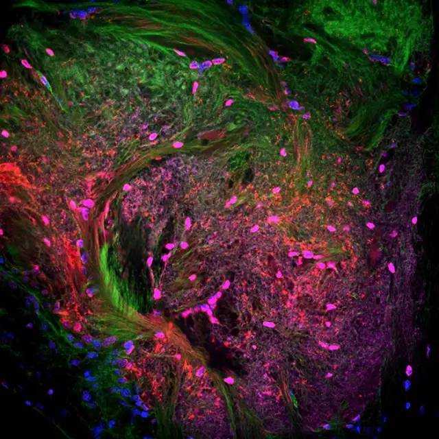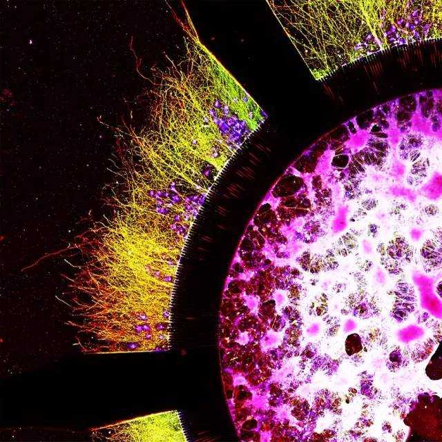 这张《轴突花瓣》图像由Meunier实验室博士后研究人员Iris Wang完成,获得技术类第一名。图像显示了在纳米器件培养的海马神经元从细胞体和树突中分离轴突。夹杂着轴突的神经胶质细胞通过不同颜色进行标记。