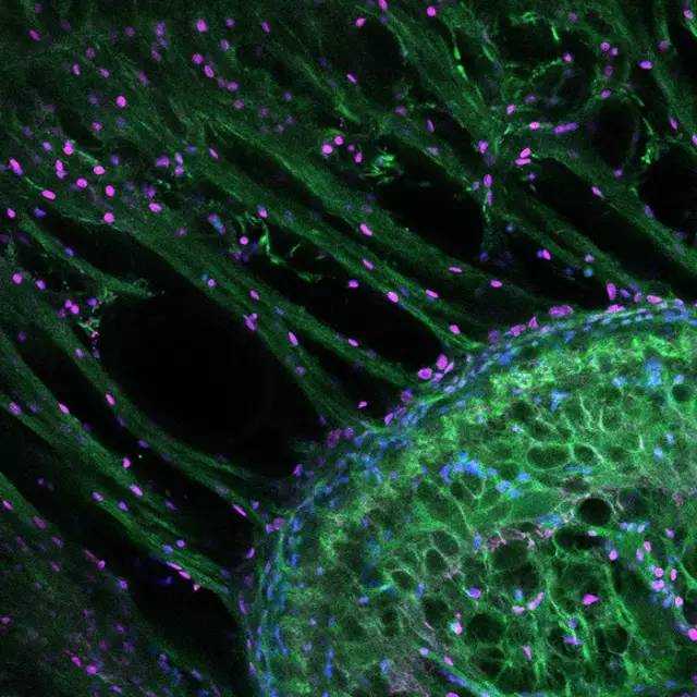 上图是一个通过荧光抗体孵化增强的虾蛄的视网膜和神经组织的图像切片。关于这些攻击性甲壳类动物的研究正在为新型仿生技术铺平道路,有望惠及快速癌症检测领域。(来源:Marshall 实验室名誉学生Trent Brooks-Richards)。