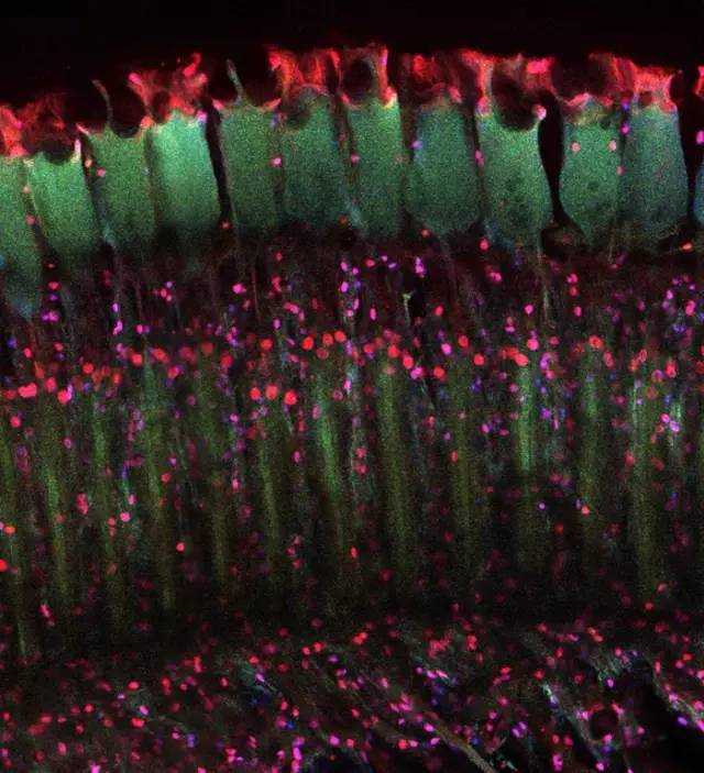 上图为荧光抗体染色的虾蛄复眼视觉单元的截面。(来源:Marshall Lab实验室荣誉学生Trent Brooks-Richards)。