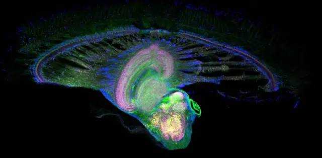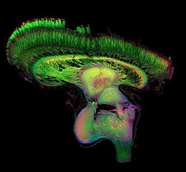上图为斑马鱼在受精三天后的大脑图像,包括脑、视顶盖和中脑。(来源:Mowry 实验室研究员Giacomotto Jean)。