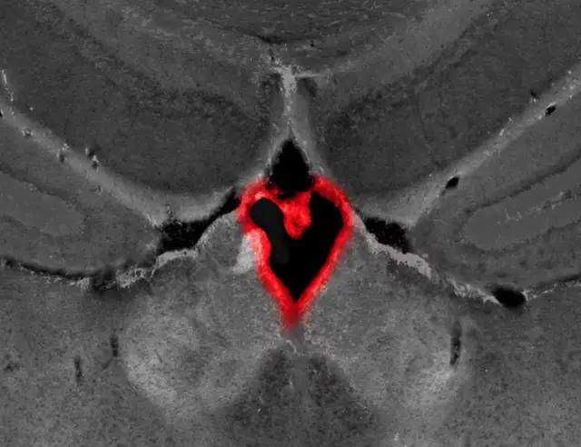 上图是大脑中部脑室充满的流体,其中细胞(脉络丛)形成了一个心脏形状。(来源:Burne 实验室客座研究科学家Dana Bradford)。