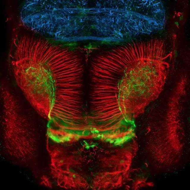 Srinivasan 实验室博士研究生Kiaran Lawson赢得了艺术类奖项,其图像描述的是束缚到一根金属棒的果蝇迅速飞过虚拟环境。Srinivasan 实验室专注于蜜蜂和苍蝇如何通过视力来塑造自己的行为。