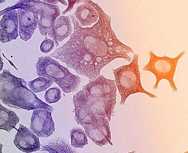 上图:神经瘤细胞中染色的微管蛋白揭示了复杂的细胞骨架网络。(Götz实验室博士研究生Nadia Cummins)