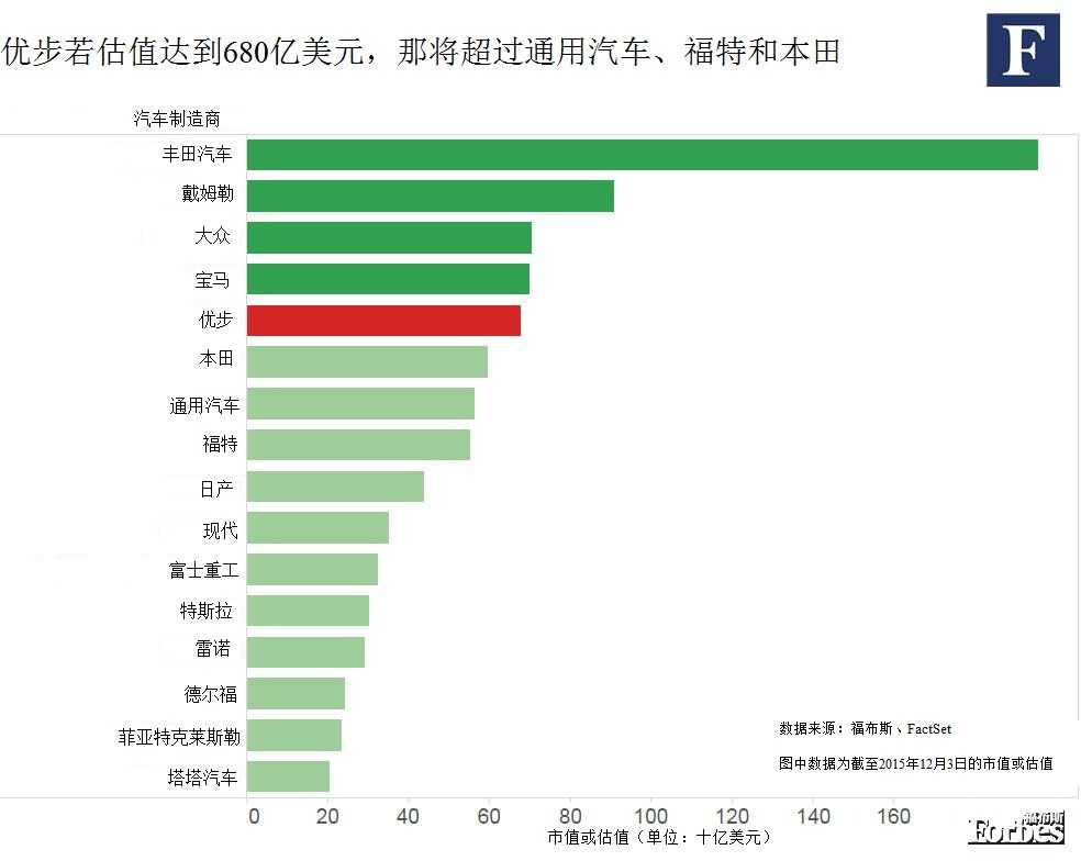 当优步计划进行新一轮21亿美元融资(这将会使其融资总额达到将近100亿美元)的时候,这家打车应用希望获得高达680亿美元的估值。这与今年早些时候的520亿美元估值相比有大幅暴涨,而且这也标志着一个重要的里程碑:就估值而言,优步将首次跨越式超过通用汽车(General Motors)、福特汽车(Ford Motor)和本田汽车(Honda Motor)这些标志性汽车制造商,同时几乎赶上诸如大众(Volkswagen)和宝马(BMW)等其他豪华汽车制造商。