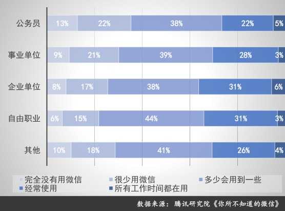 值得注意的是,微信在各类组织中都保持了对工作场景的自发高渗透,不论是完全自主的自由职业者、相对自由的企业单位、还是工作氛围严谨的政府机构,都是如此。