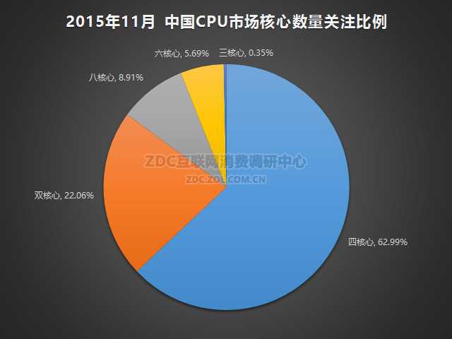2015年11月中国的CPU市场上,四核产品的关注度比例为62.99%,远远高于其它类型的产品。其次,双核心CPU的关注比例为22.06%,八核心产品的关注比例为8.91%,六核心产品的关注度占比为5.69%,三核心产品的关注比例为0.35%。