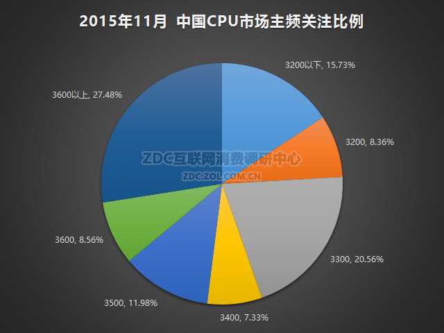 2015年11月中国桌面级CPU市场上,主频率3300MHZ的产品关注比例为20.56%,3500MHz的关注度占比为11.98%,3600MHz的关注比例为8.56%,3200MHz产品关注度占比为8.36%,3400MHz占比为7.33%,3600MHz以上产品的关注比例为27.48%,3200MHz以下的占比为15.73%。