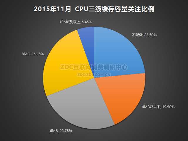 ZDC数据显示,2015年11月中国桌面级CPU市场上,接近80%的用户关注CPU的三级缓存容量,三级缓存容量为6MB的产品关注比例为25.78%,8MB三级缓存的关注比例为25.36%,4MB及以下的关注度占比为19.90%,10MB及以上占比5.45%。不配备三级缓存的CPU产品关注比例只有23.50%。