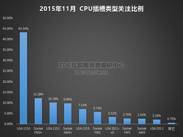 在插槽类型方面,2015年11月中国的CPU市场上,支持LGA 1150的产品吸引了43.34%的市场关注度,Socket FM2+的关注比例为12.28%,LGA 1151的关注度占比为10.19%,Socket AM3+占比9.89%,LGA 1155的关注度占比7.14%,Socket FM2占比为5.73%。