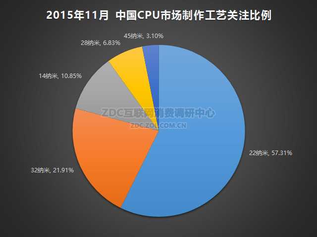 ZDC数据显示,2015年11月中国桌面级CPU市场上,22nm制作工艺的CPU产品依然是最受关注的,其关注度占比为57.31%。其次,32nm的产品关注比例为21.91%,14nm产品关注度占比为10.85%,28nm占比6.83%,45nm占比为3.10%。