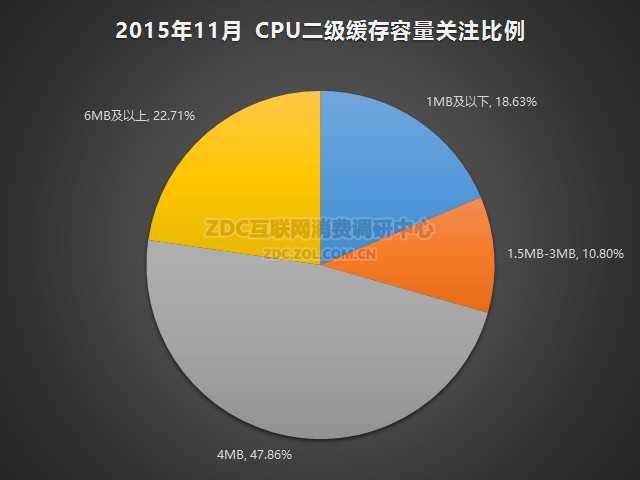 2015年11月中国的桌面级CPU市场上,二级缓存为4MB的产品关注比例最高,为47.86%;二级缓存容量为6MB及以上产品关注比例为22.71%,二级缓存容量为1MB及以下的产品关注度占比为18.63%;二级缓存容量在1.5MB-3MB的产品关注比例为10.80%。